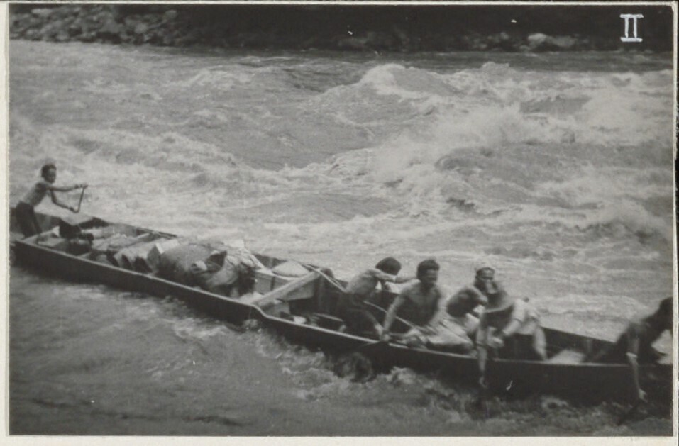 Een prauw met de bagage van de heer Tillema in een woeste stroomversnelling