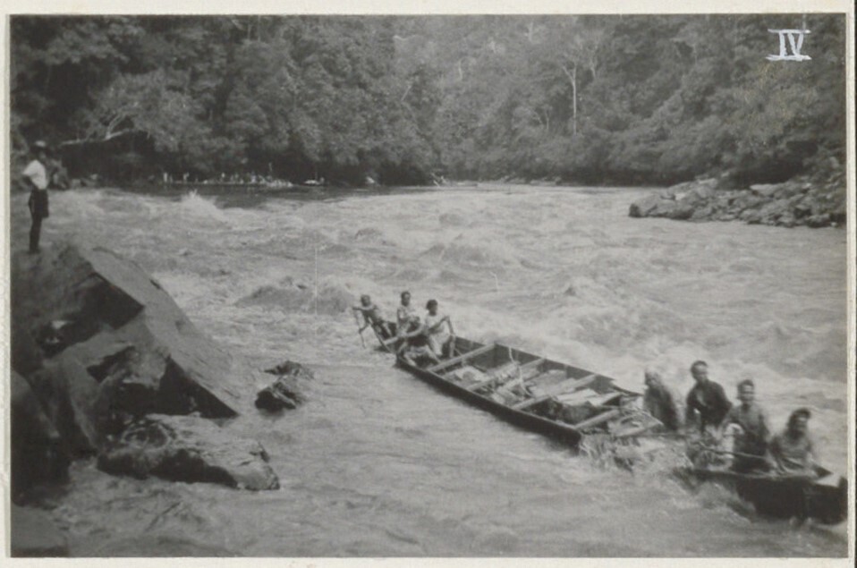 Een prauw met de bagage van de heer Tillema in een woeste stroomversnelling