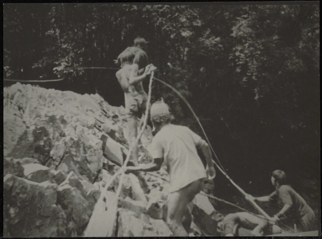 Het aan de kant trekken van een prauw met rotankabels
