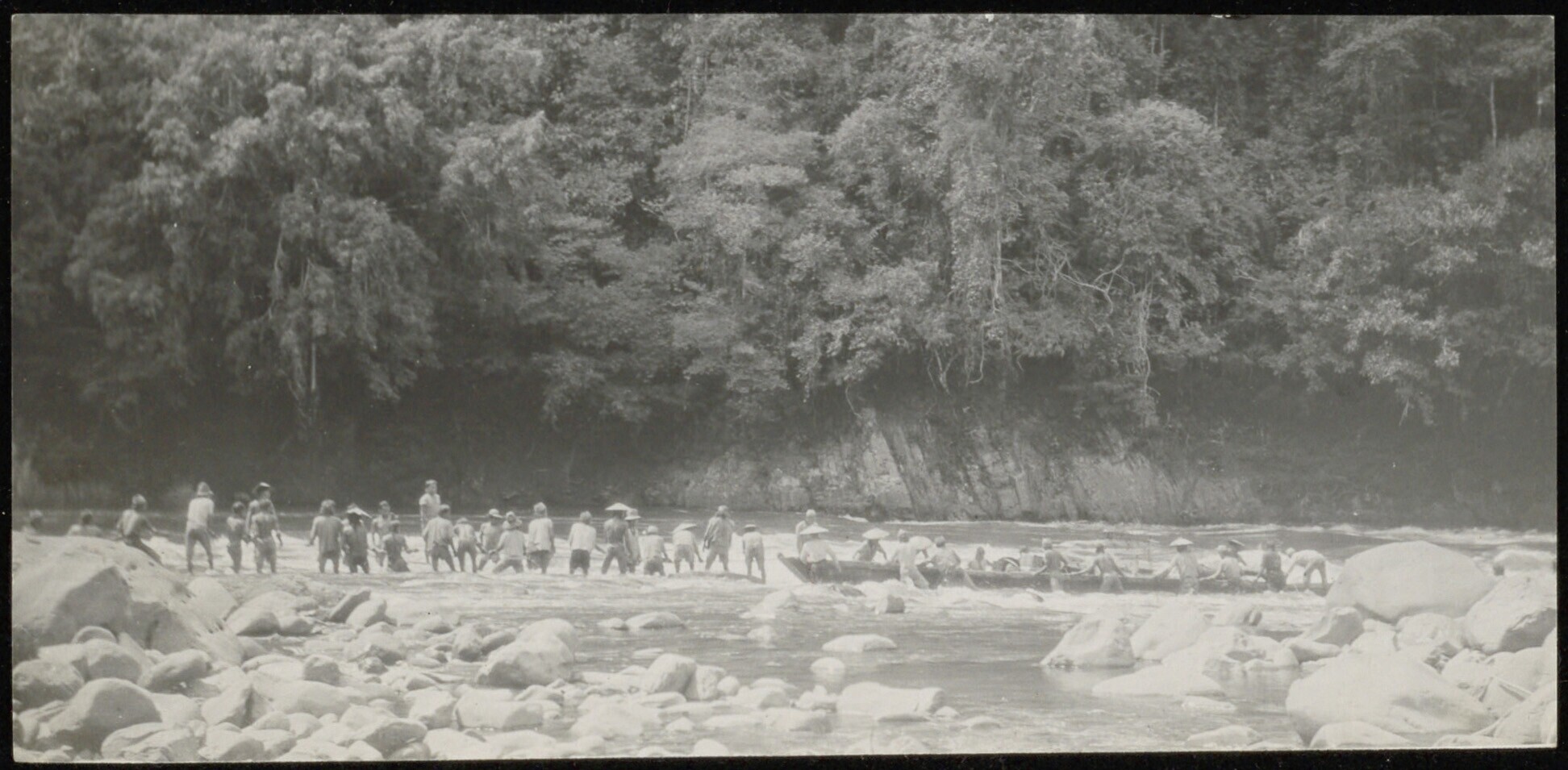 Een prauw wordt met een rotankabel verdergetrokken