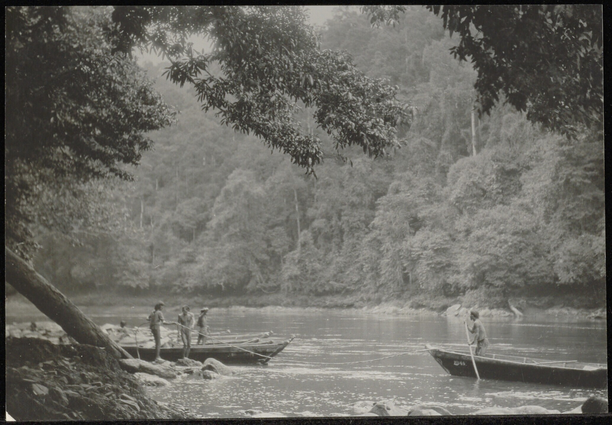 Een groep Dajaks in de weer met een prauw