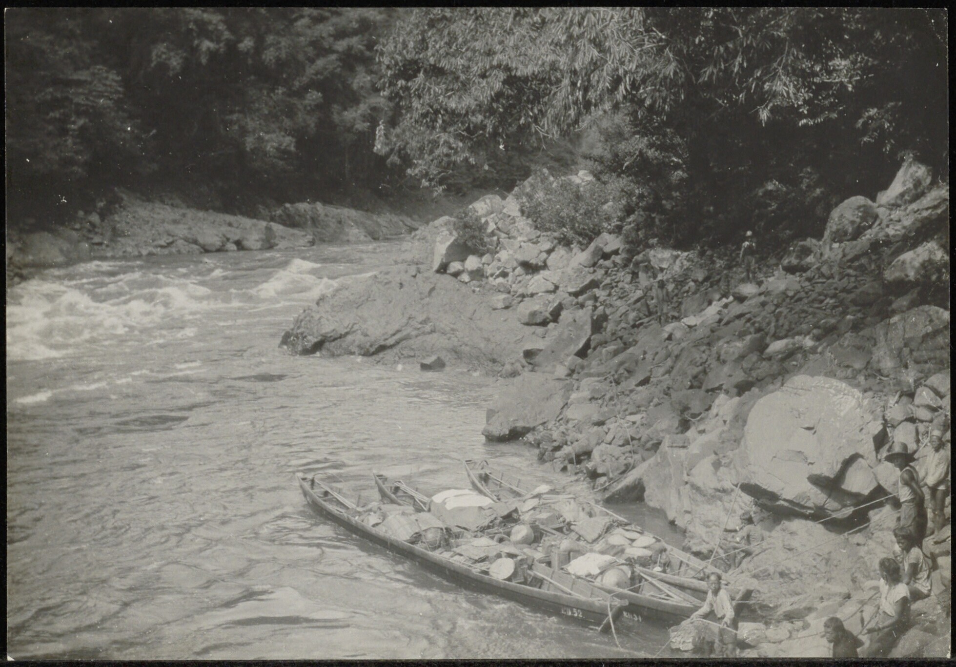 Een aantal prauwen langs een oever
