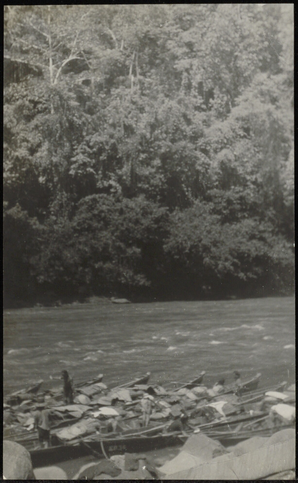 Een aantal volgeladen prauwen met de bagage van de heer Tillema langs een oever