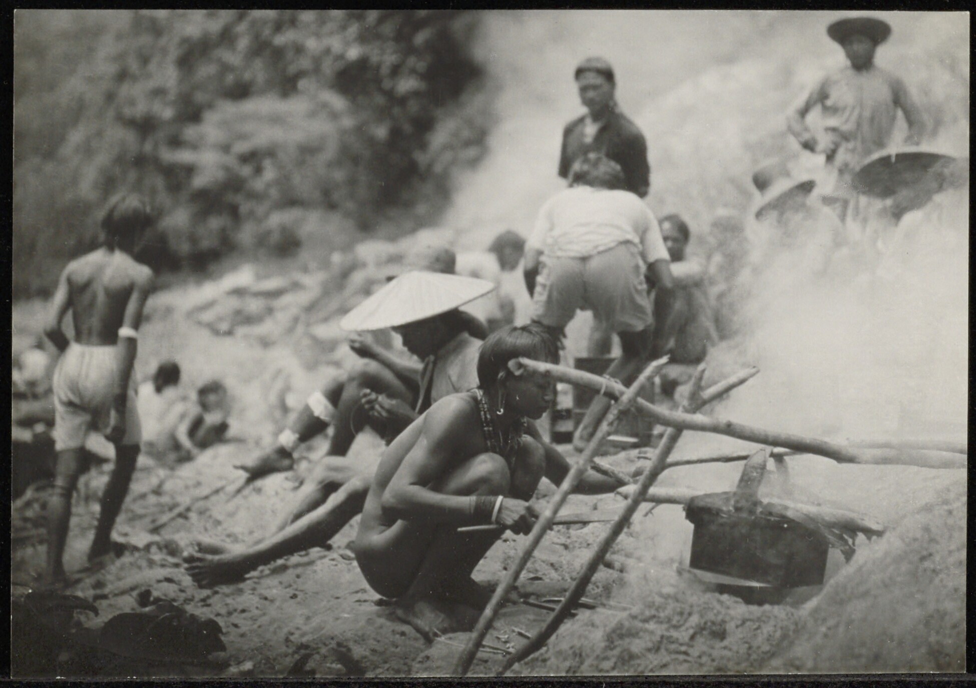 Een groep Dajaks bezig met het voorbereiden van het voedsel