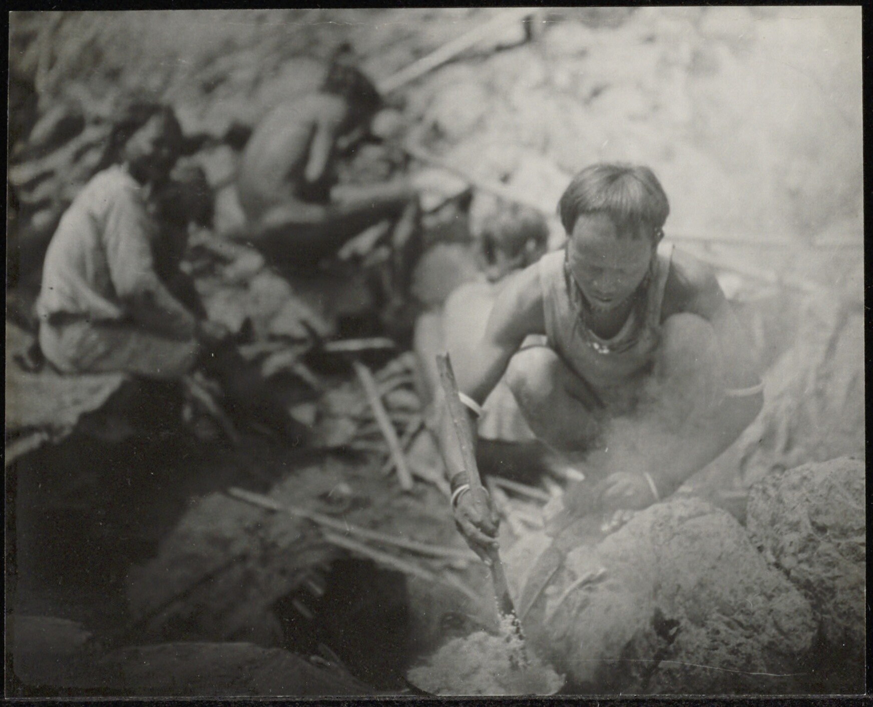 Een groep Dajaks bezig met het voorbereiden van het voedsel