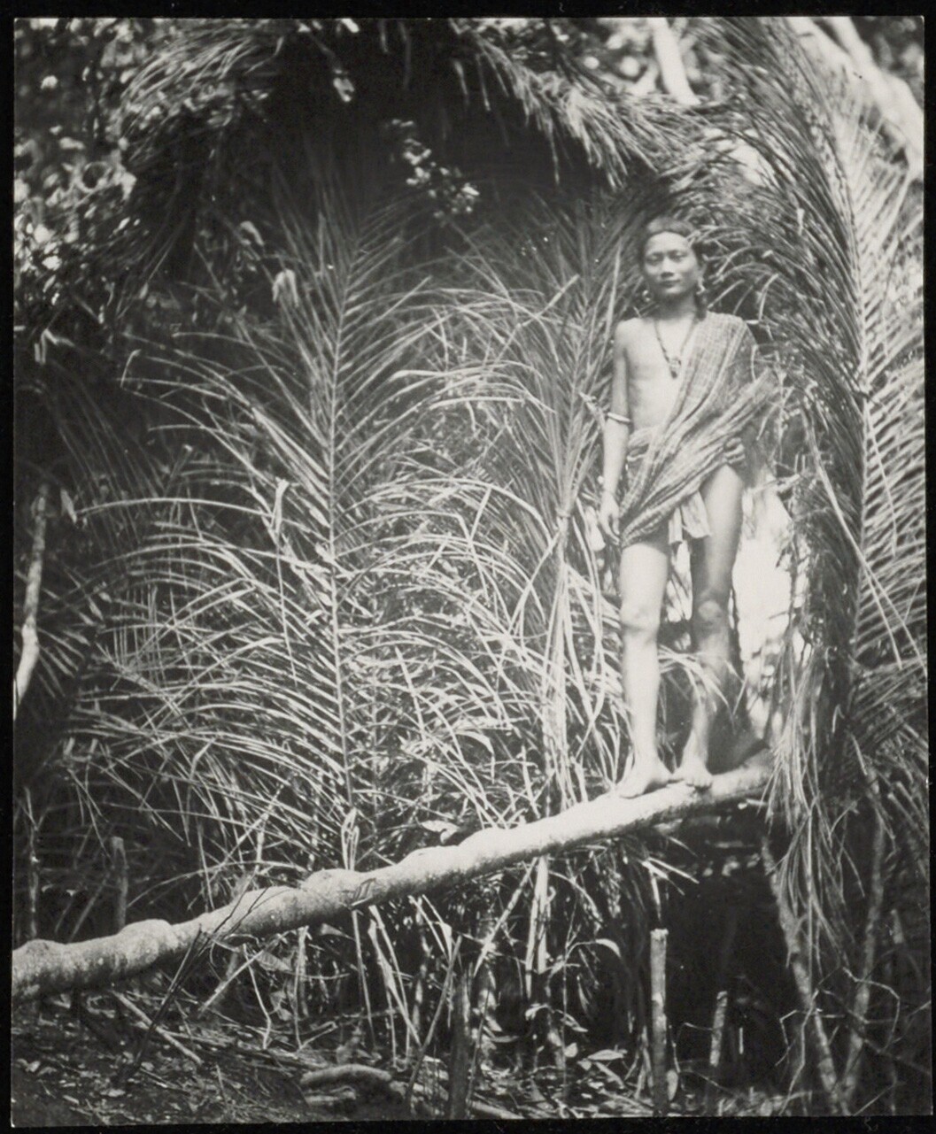 Een Poenan Moesang man staande in een deuropening van palmtakken
