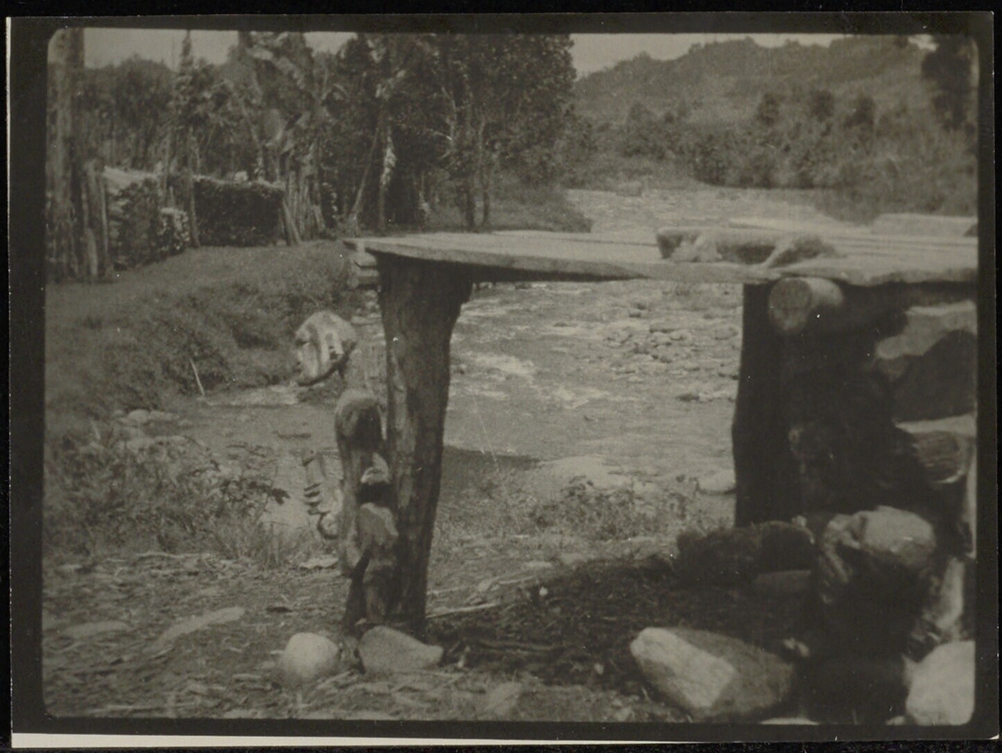 Een rustplaats met een schrikbeeld voor het neerzetten van volle rijstmandjes na de terugkeer van het rijstveld