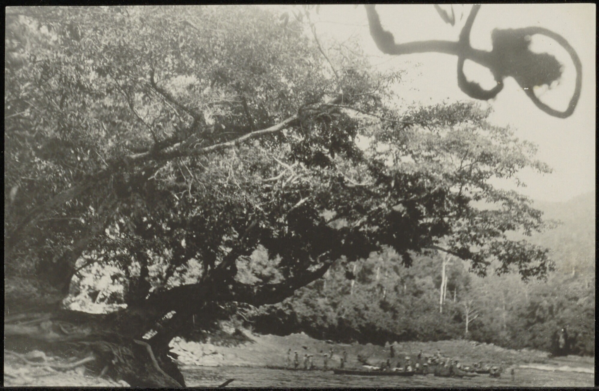 Een groep Dajaks met prauwen langs een rivieroever