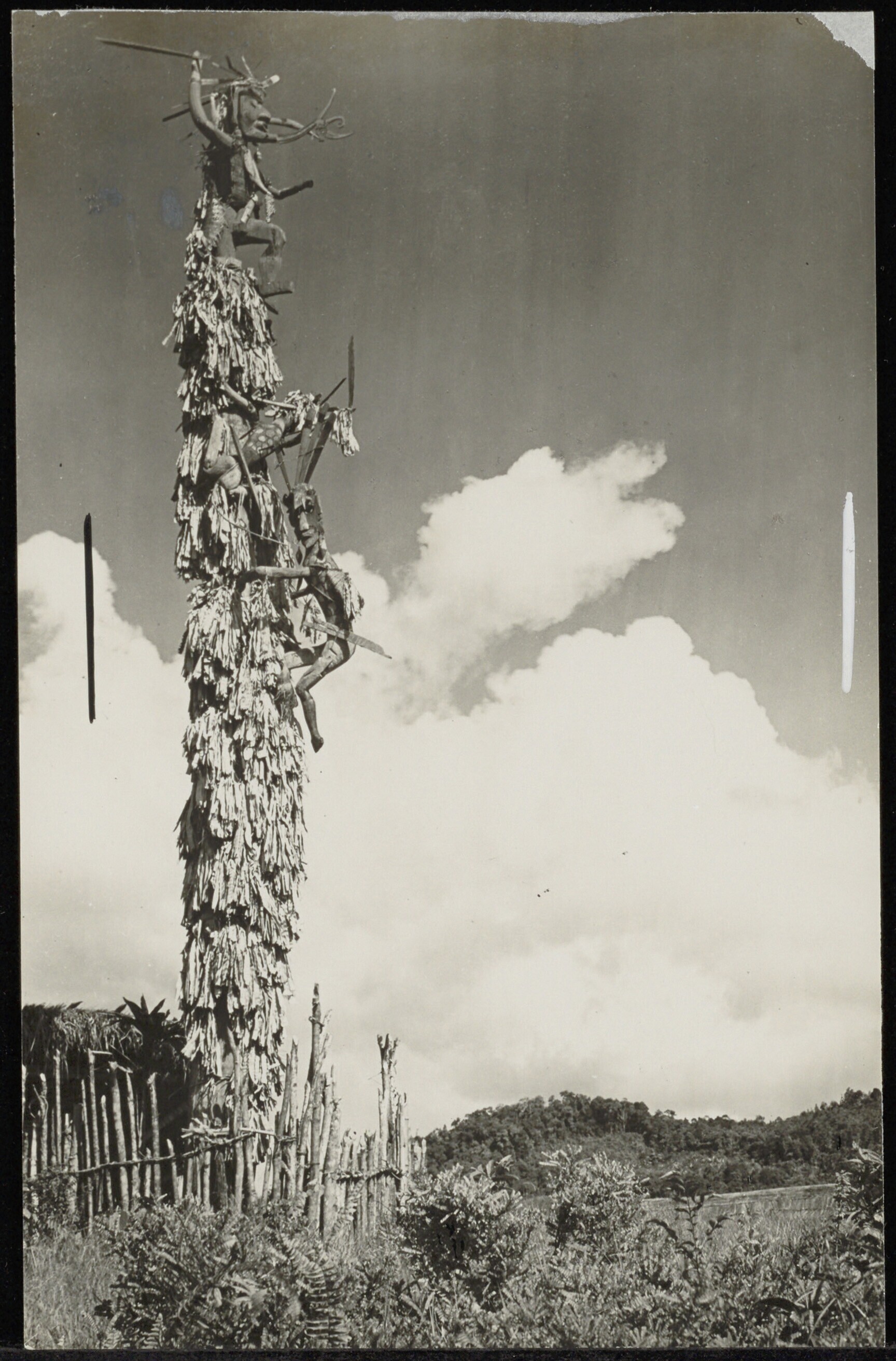 Rituele paal waaraan menselijke figuren zijn bevestigd