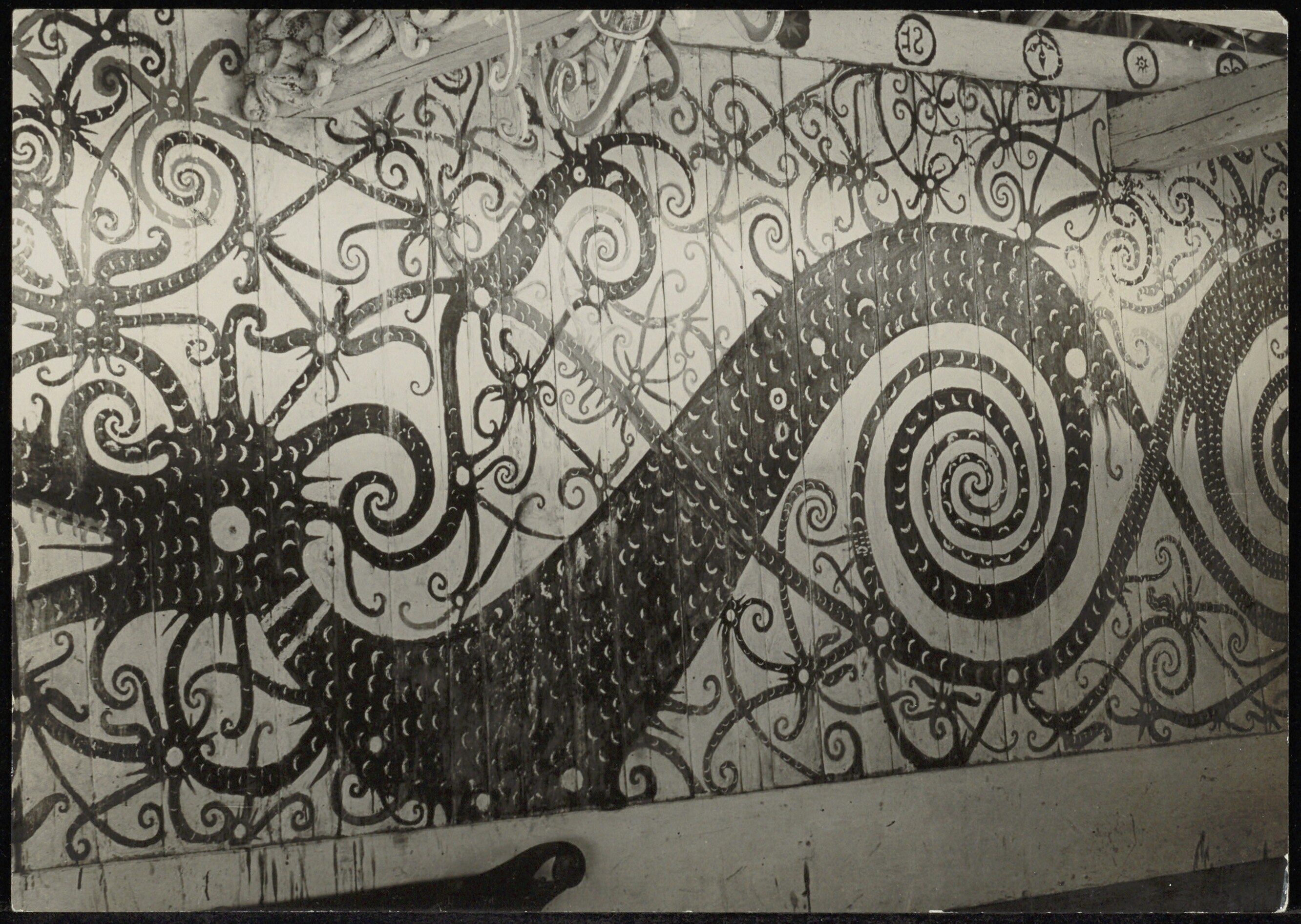 Wand beschilderd met patronen van arabesken. De teekeningen stellen voor de äsoe"(den draak)