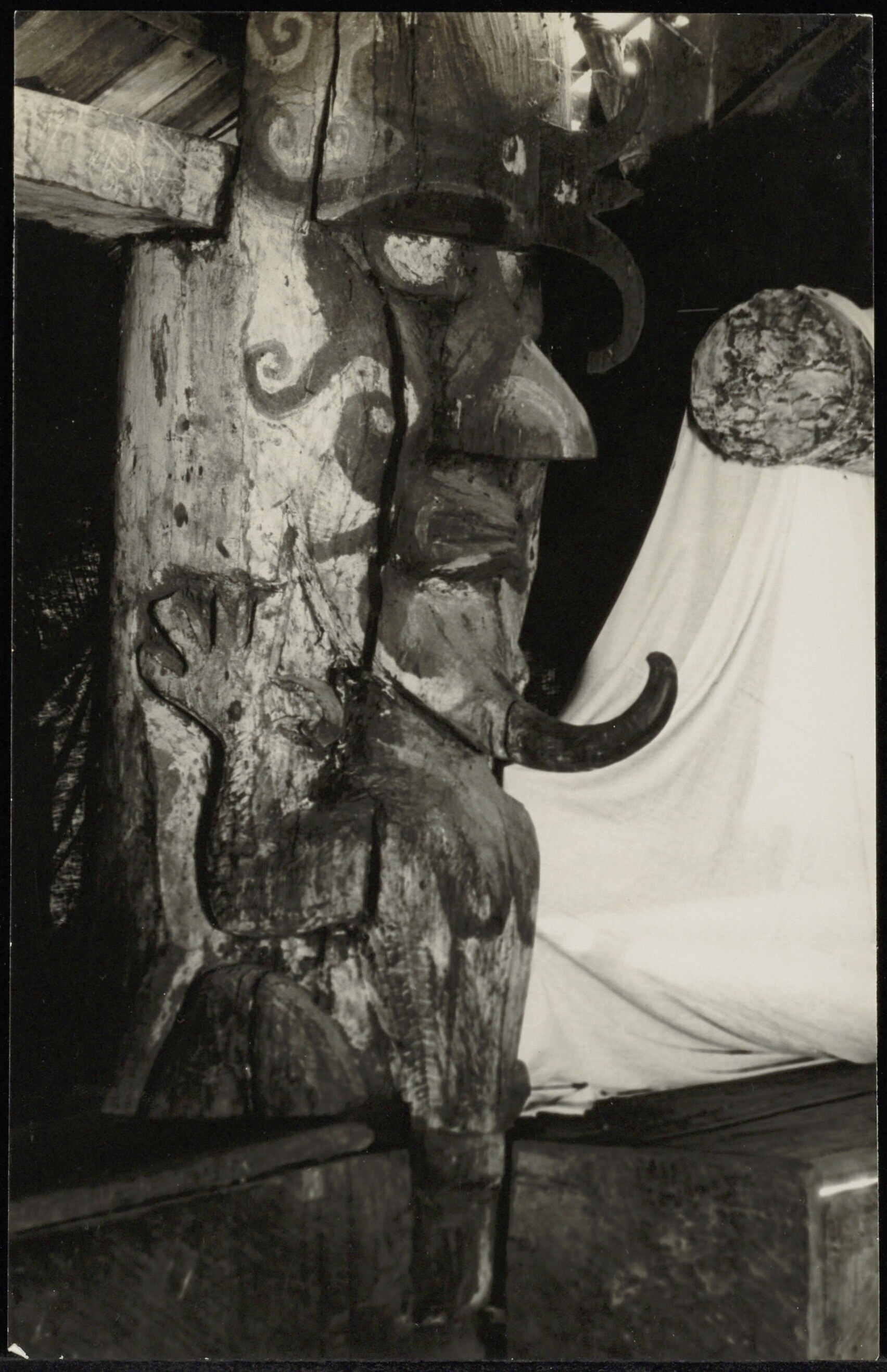 Houtsnijwerk op een pilaar die deel uitmaakt van een grotere constructie