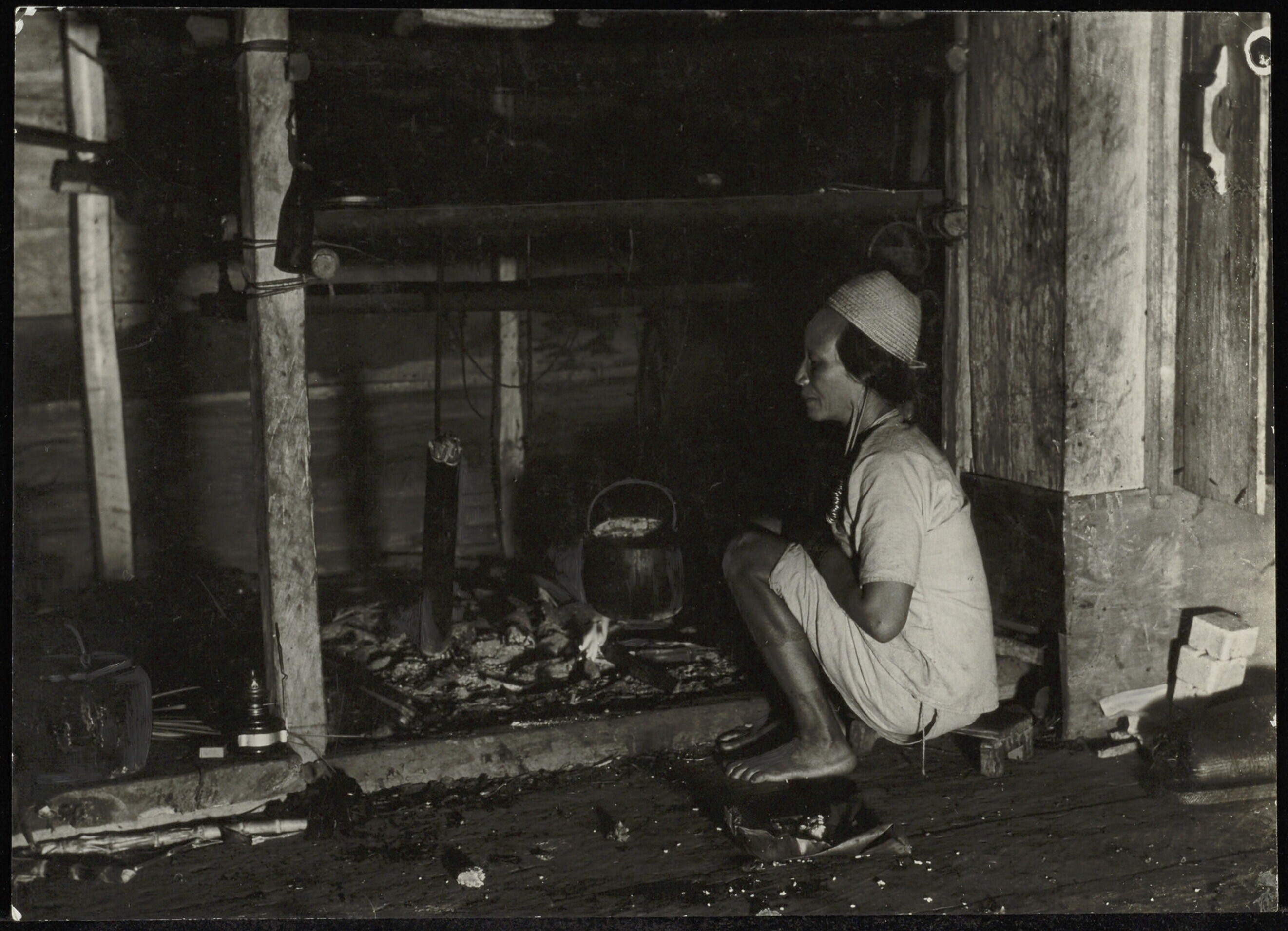 Dayak bij een vuurplaats in woning