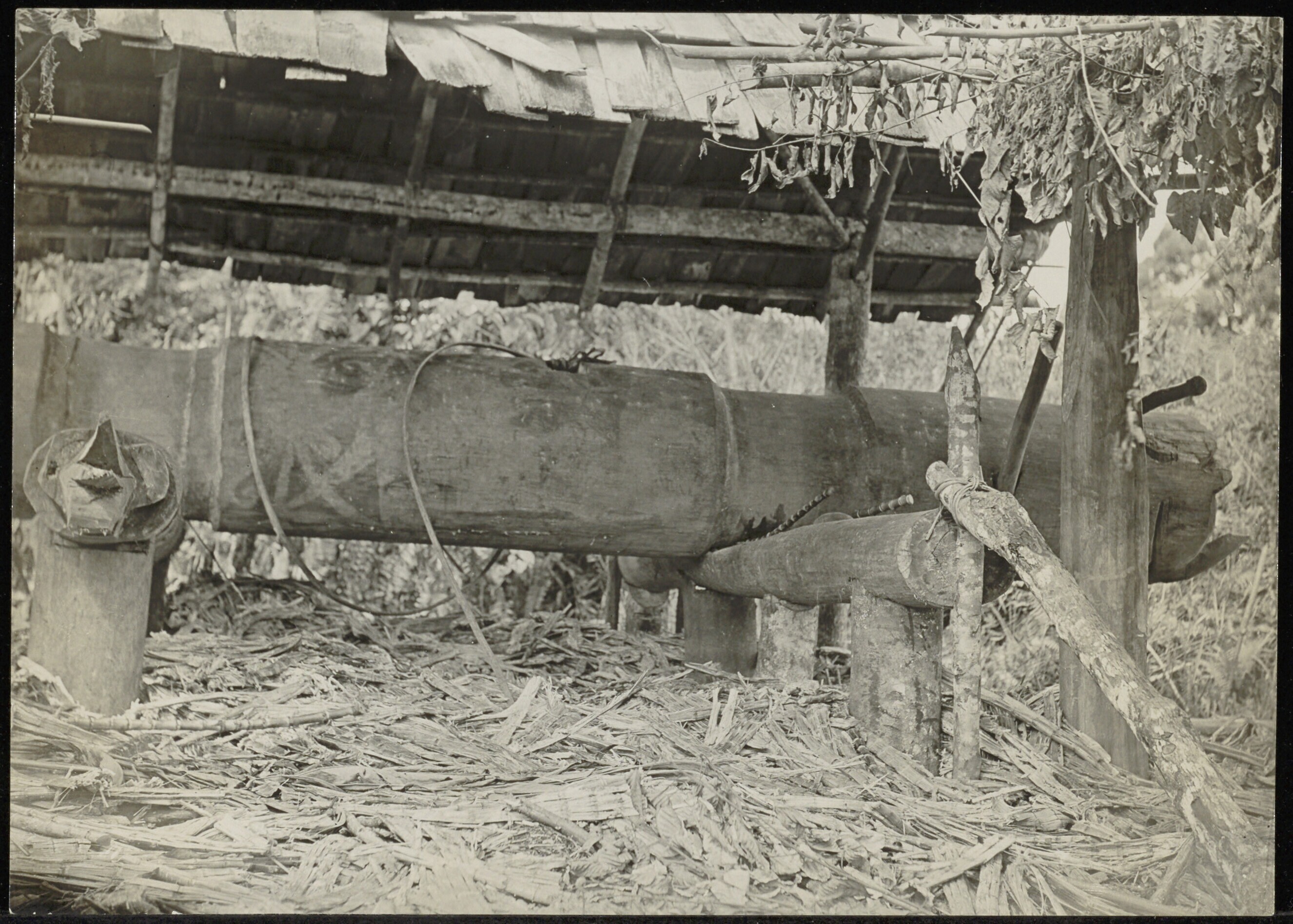 Uitgeholde boomstam op schragen mogelijk dienstdoend als zoutmolen