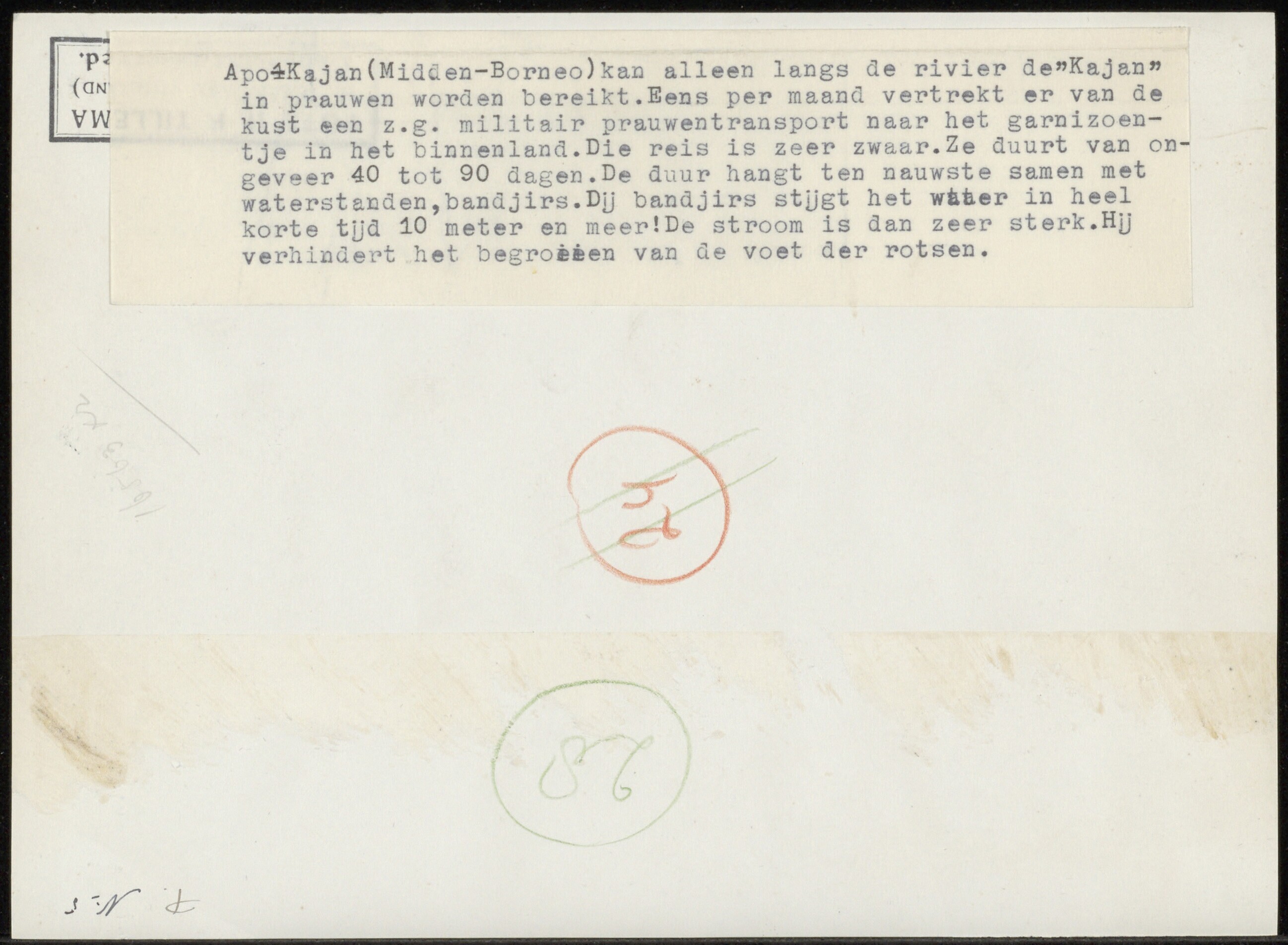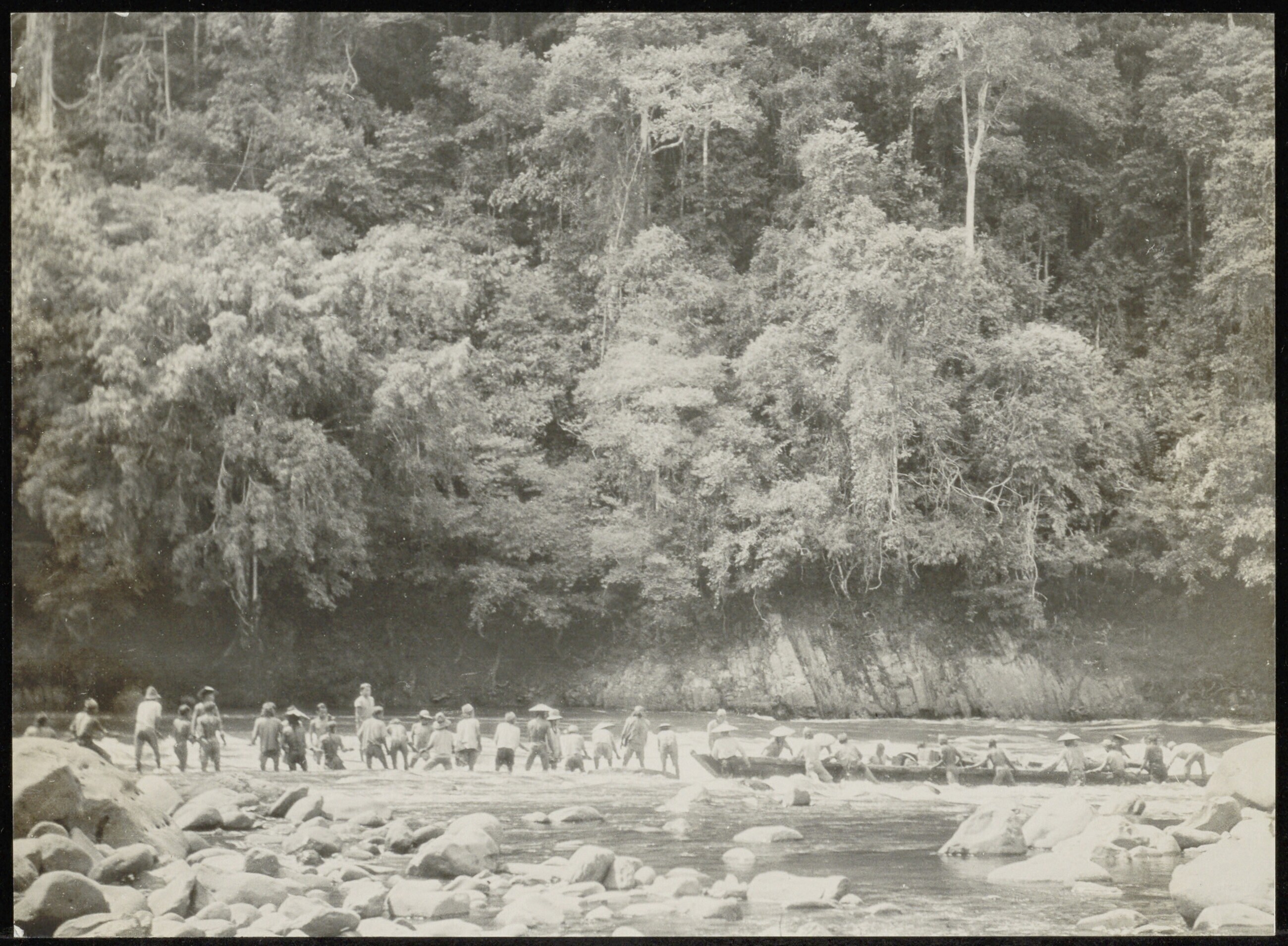 Prauwen en mensen aan de oever van de Kayan-rivier op de route naar Apo-Kayan op Midden-Borneo