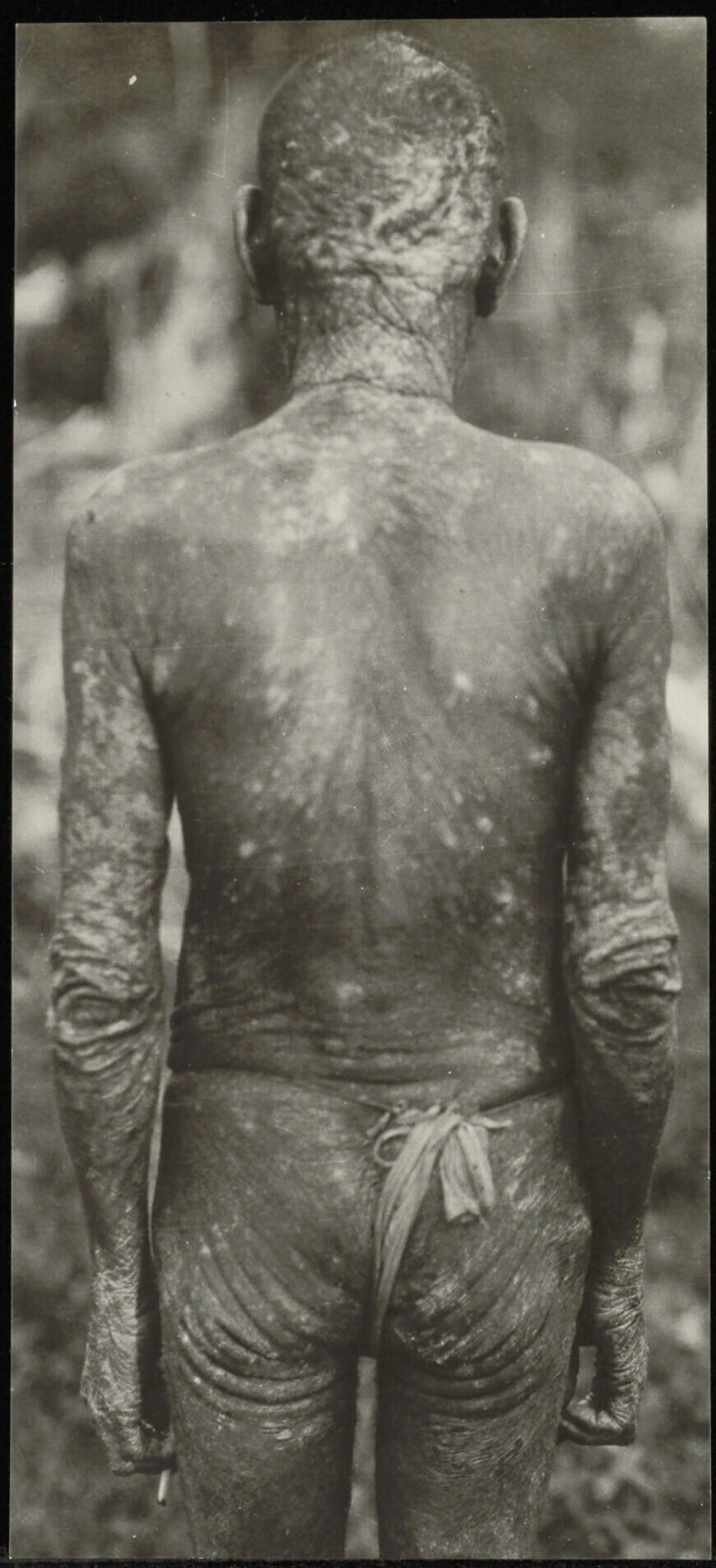 Man met een huidziekte, op de rug gezien