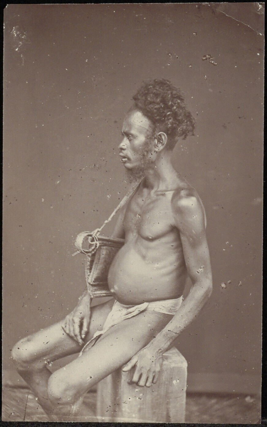 Een koppensneller met een tas voor het gesnelde hoofd