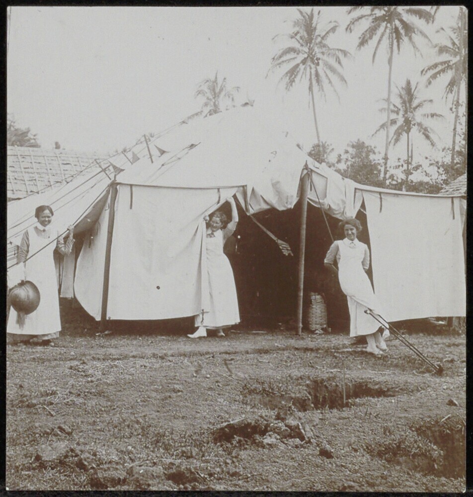 Drie verpleegsters voor een grote witte tent op Java ten tijde van pestbestrijding