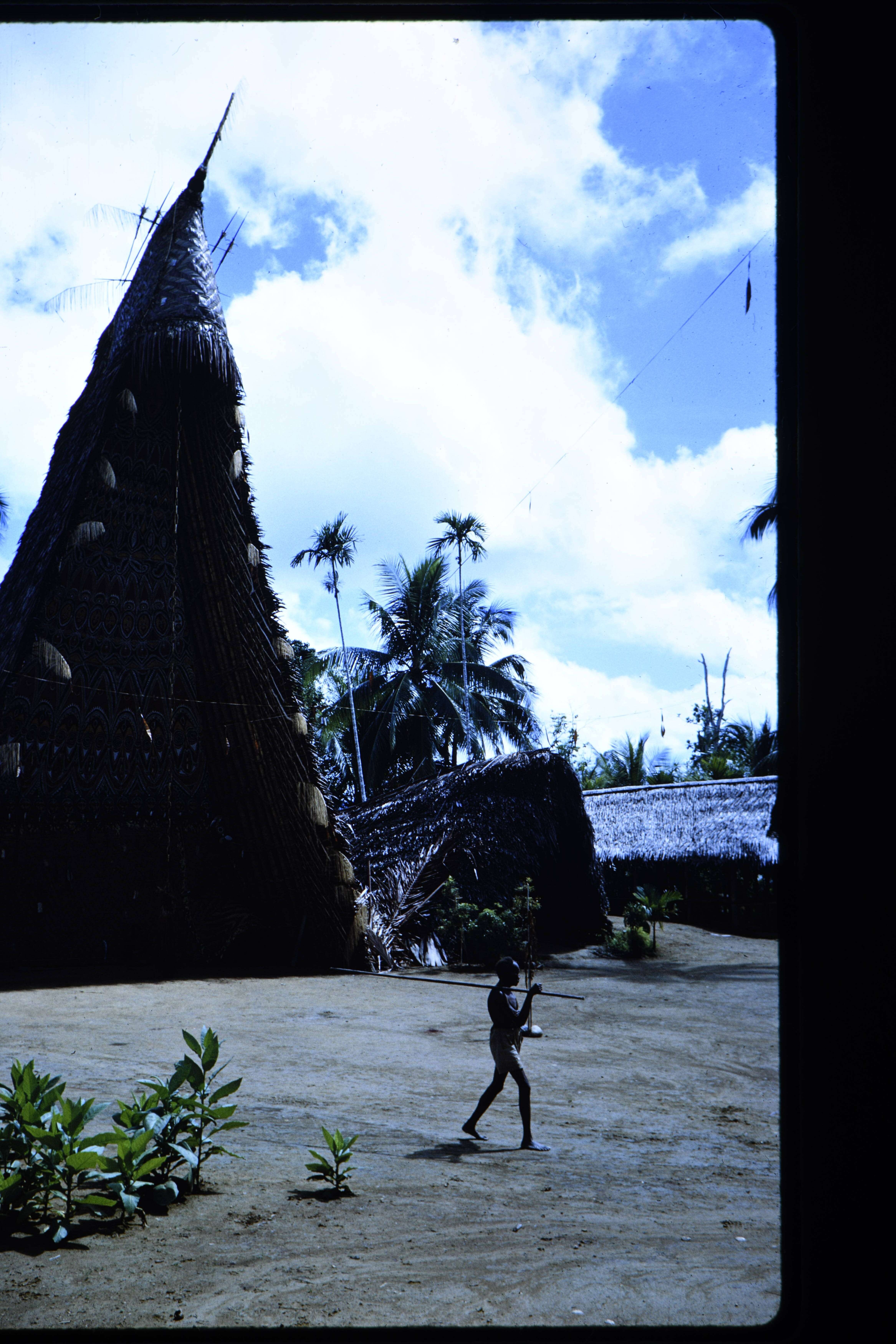 Exterieurs van nieuwe house Tamberam in Kalabu I. O.a. van het door de tromtouwen bewegende zonnemotief in het midden van de dansplaats. 4 Juli 1967.