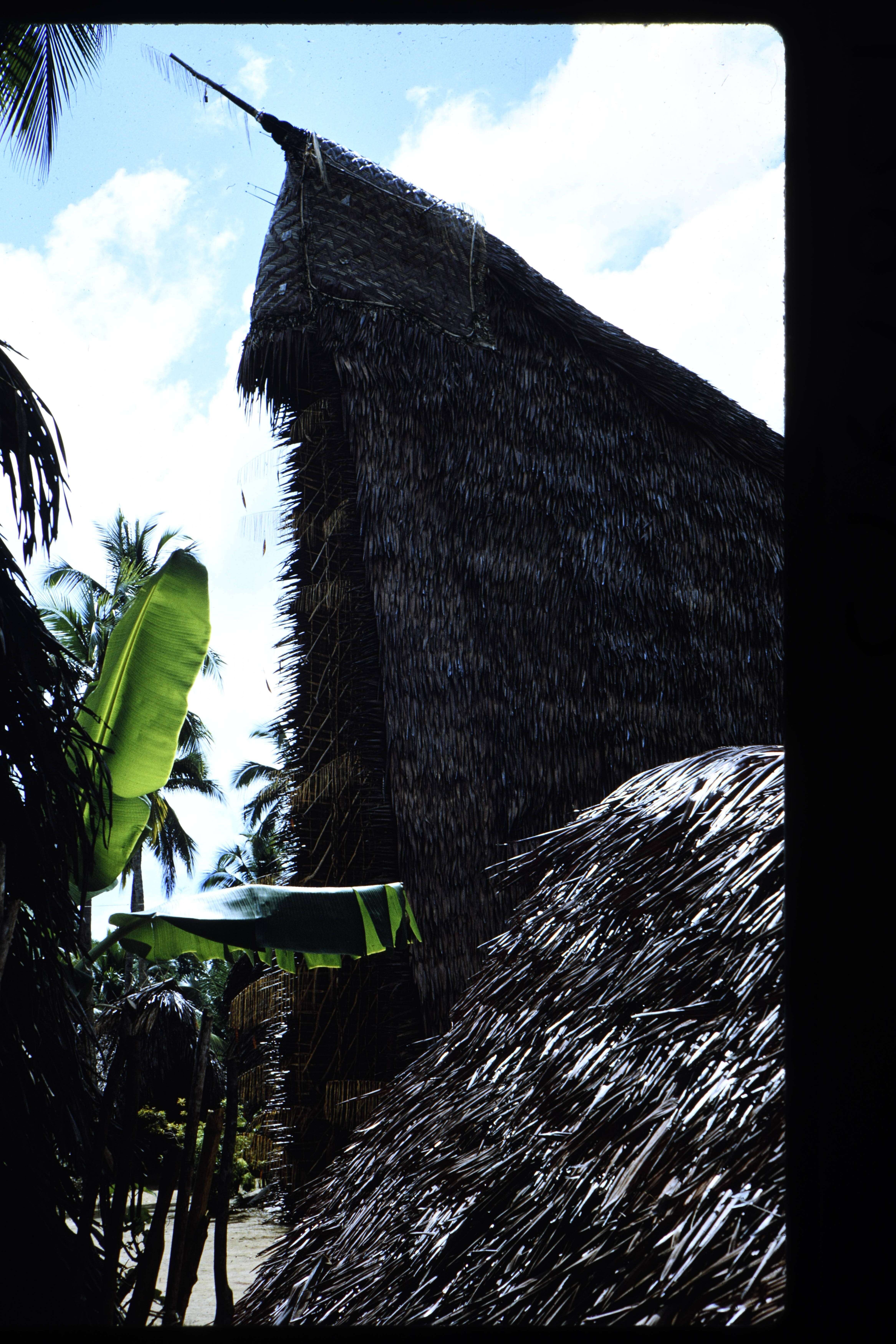 Exterieurs van nieuwe house Tamberam in Kalabu I. O.a. van het door de tromtouwen bewegende zonnemotief in het midden van de dansplaats. 4 Juli 1967.