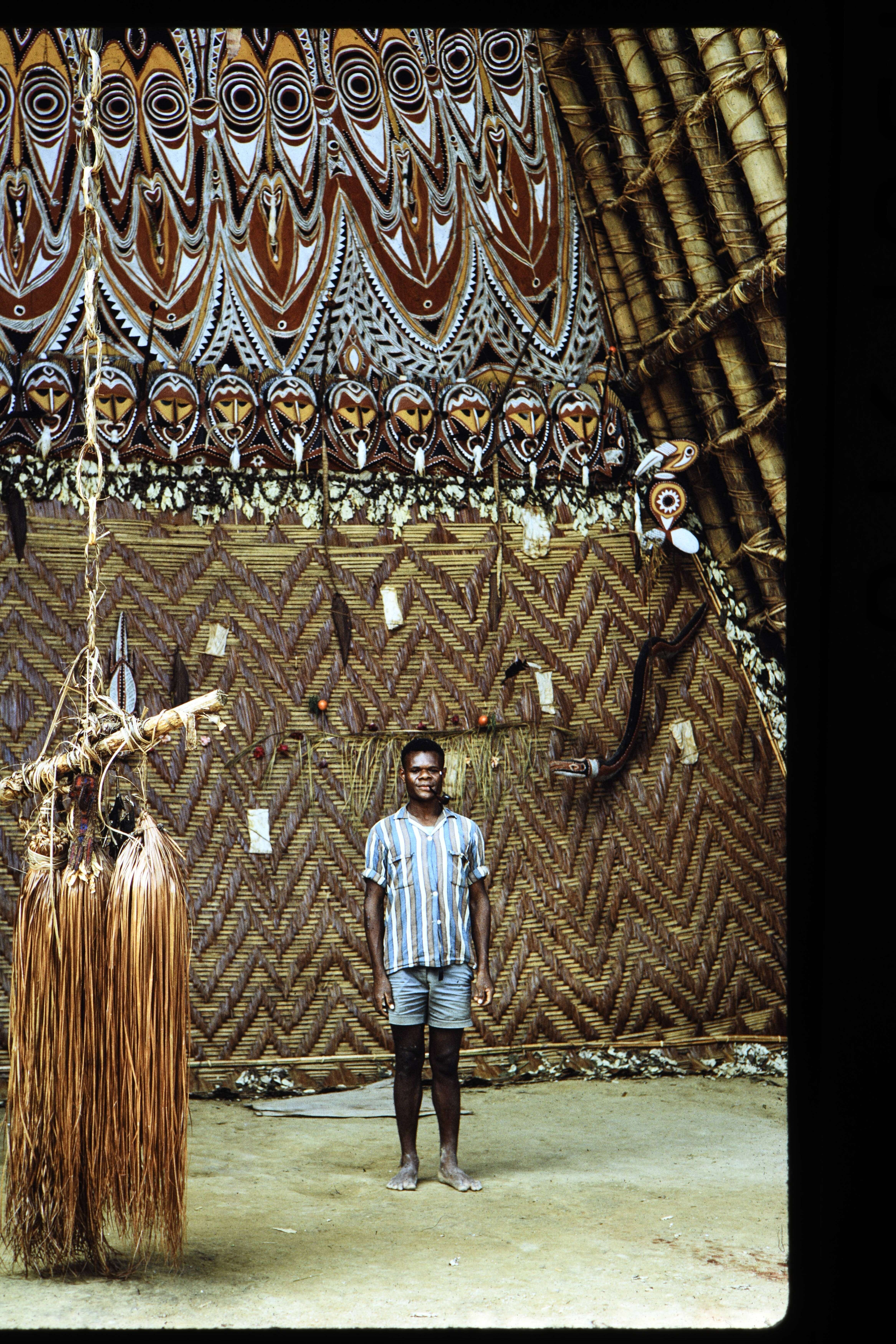 Exterieurs van nieuwe house Tamberam in Kalabu I. O.a. van het door de tromtouwen bewegende zonnemotief in het midden van de dansplaats. 4 Juli 1967.