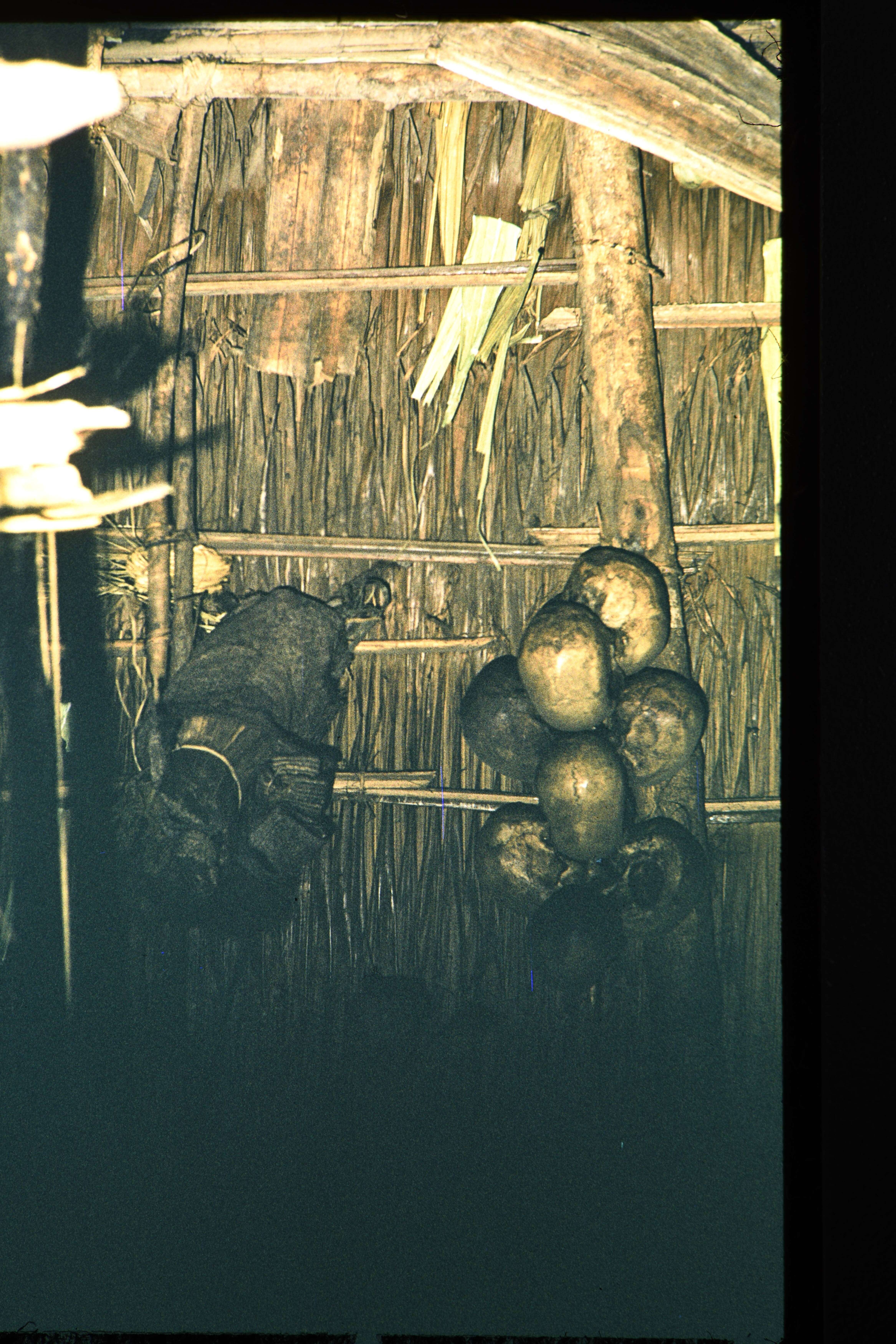 Schedelbundel hangend in hut van Ndetho, verderaf. 8 juni 1961. flash f 4 - 1/30.