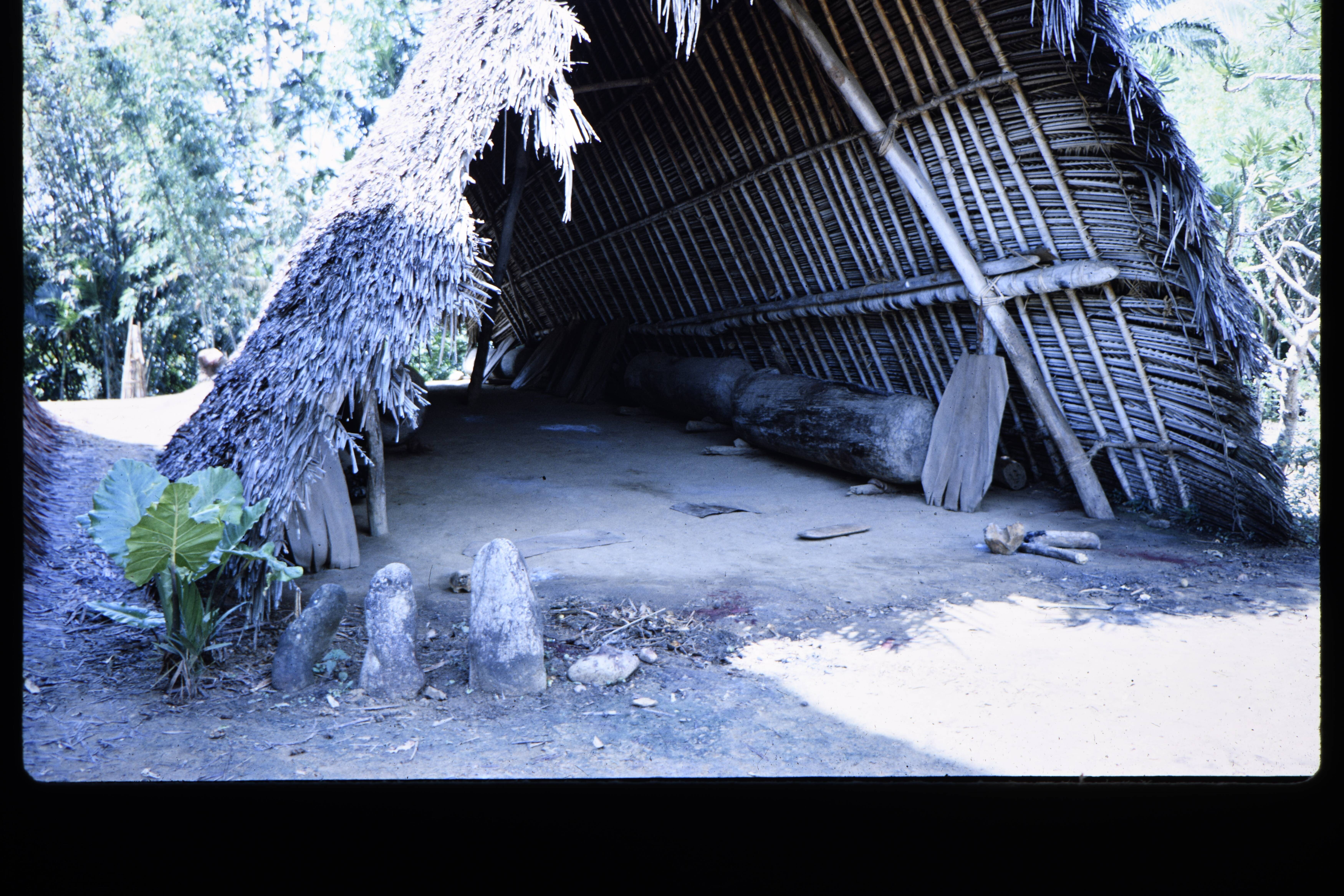 Exterieurs van nieuwe house Tamberam in Kalabu I. O.a. van het door de tromtouwen bewegende zonnemotief in het midden van de dansplaats. 4 Juli 1967.