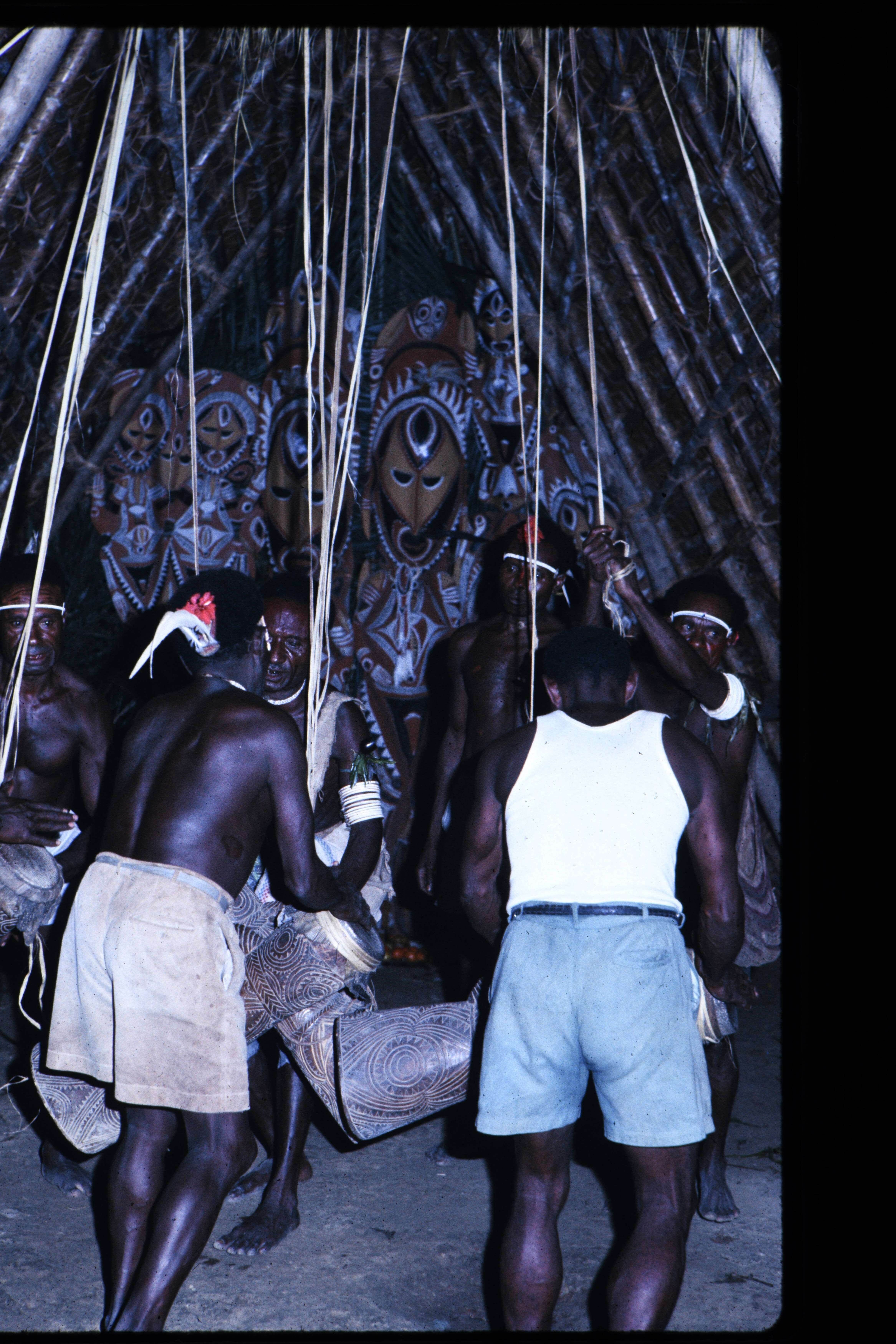 Flash opnamen van drummers in het nieuwe Tambaram huis Malpinbim in Kalabu tijdens de inwijding op zaterdag 1 Juli. Daarna flash opnamen van de opstelling der beelden tegen de beide zijden van de achterwand. Toont duidelijk dat voor verkoop beschikbare be