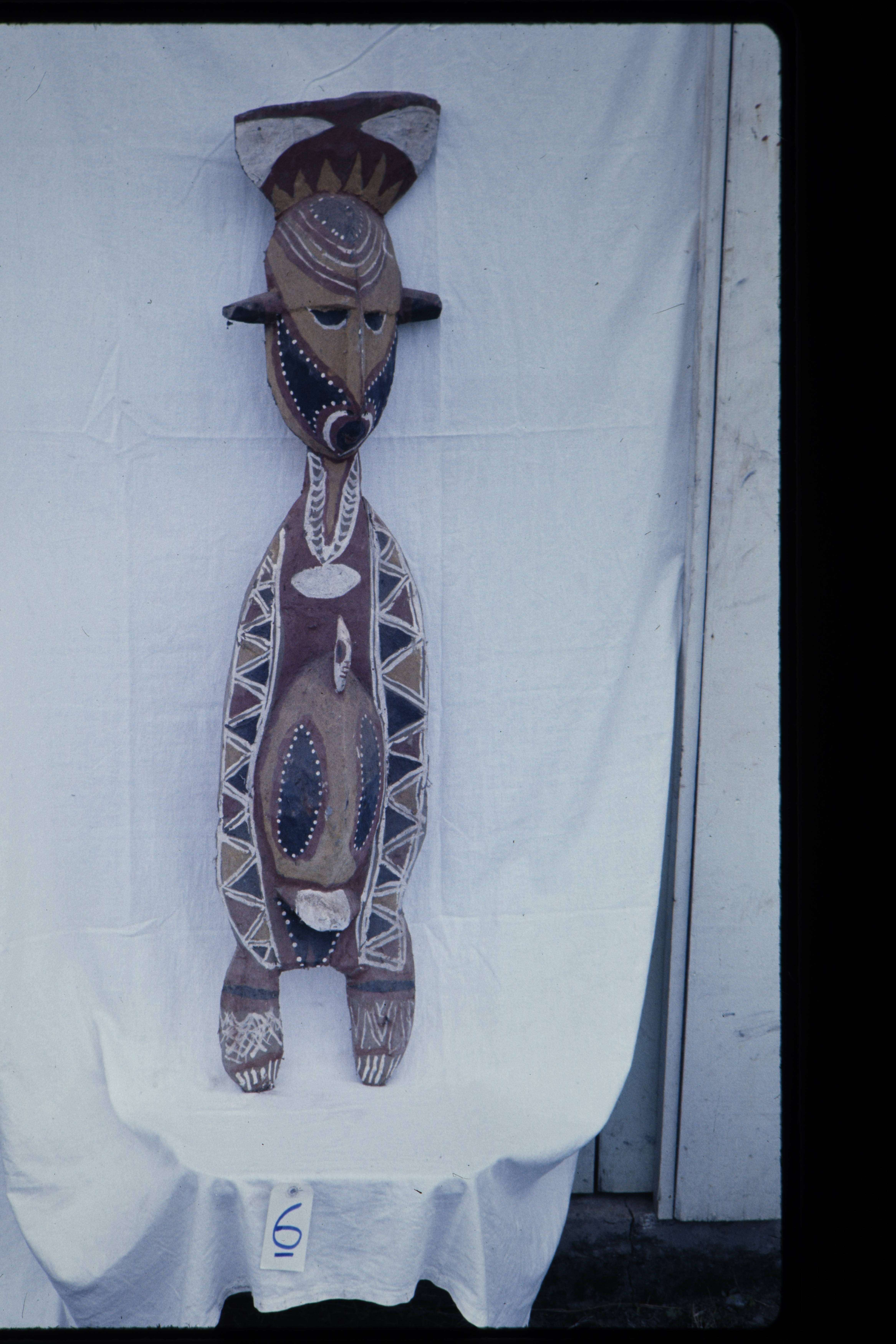 Platte figuur met vogel op buik. Mambelaib ? $ 4.00 H. 4' 9".
