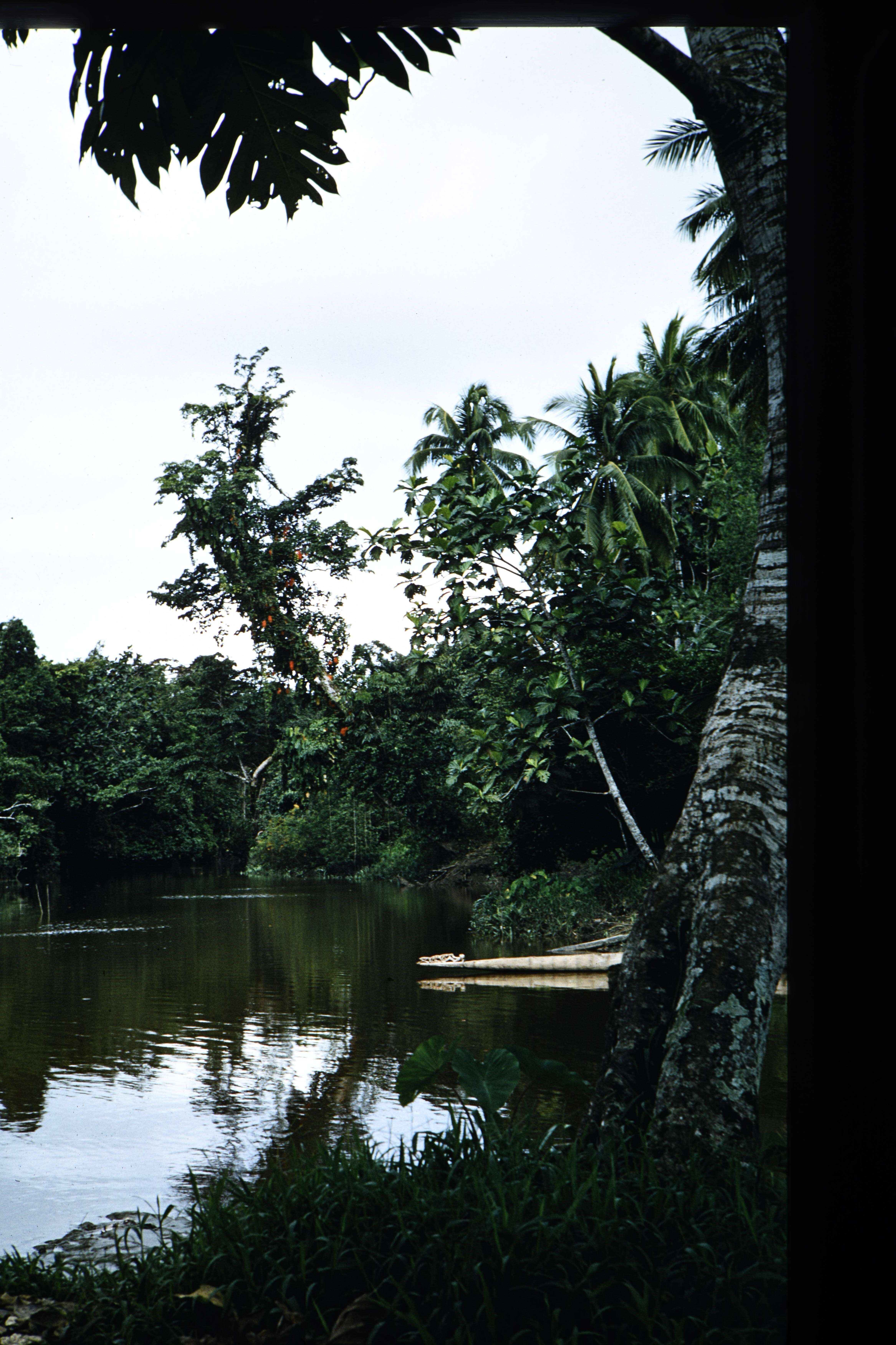 Boom over water hangend met rode bloemen, rechts prauwsteven (Omsa maker) 5 cm lens UV filter 1/50 - 6.3 + 8. 22 juli 1961.