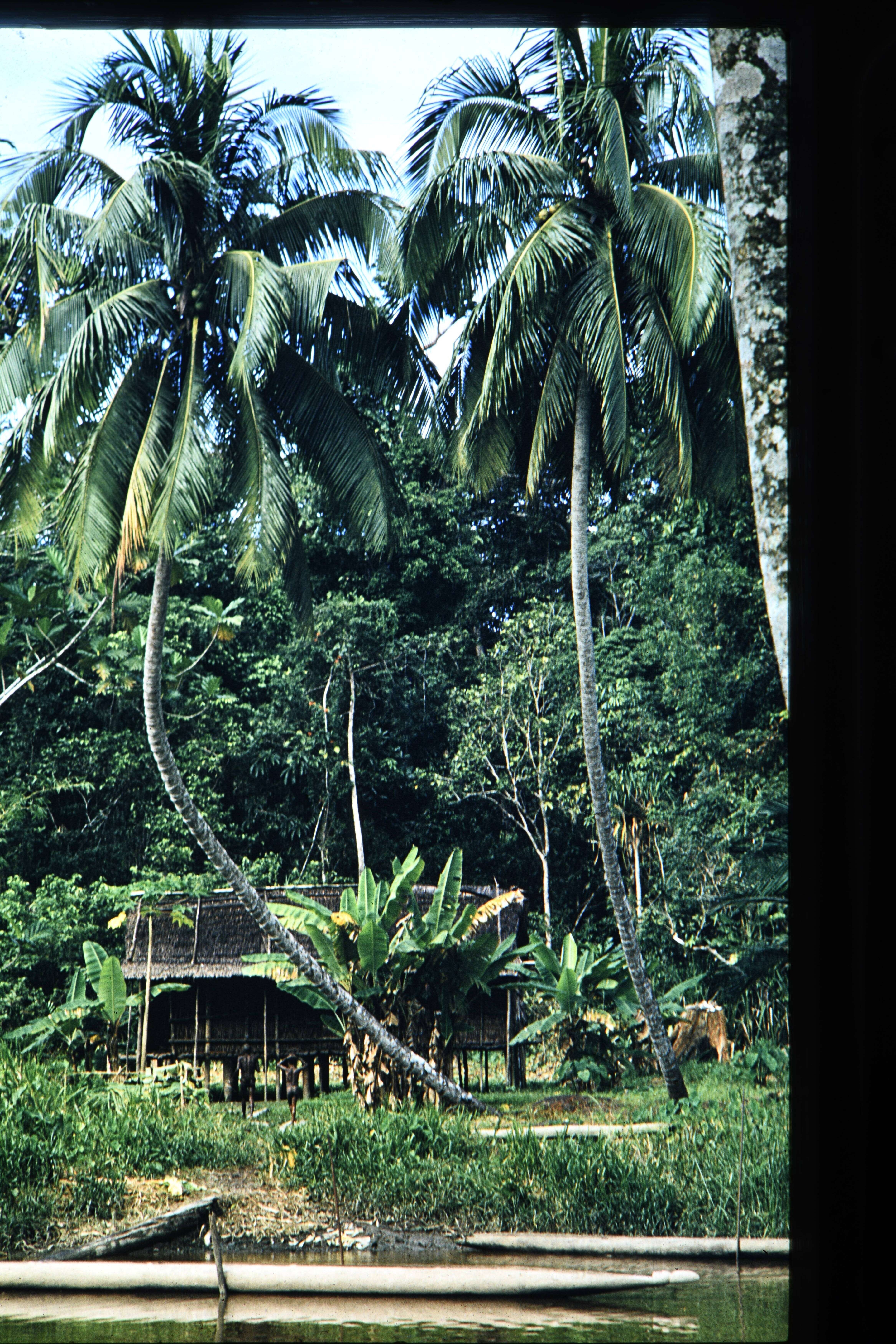 Huis van Matjemosj, met rechts 2 klapperbomen, cano op voorgrond telelens UV 1/30 f 11 (met mensen)