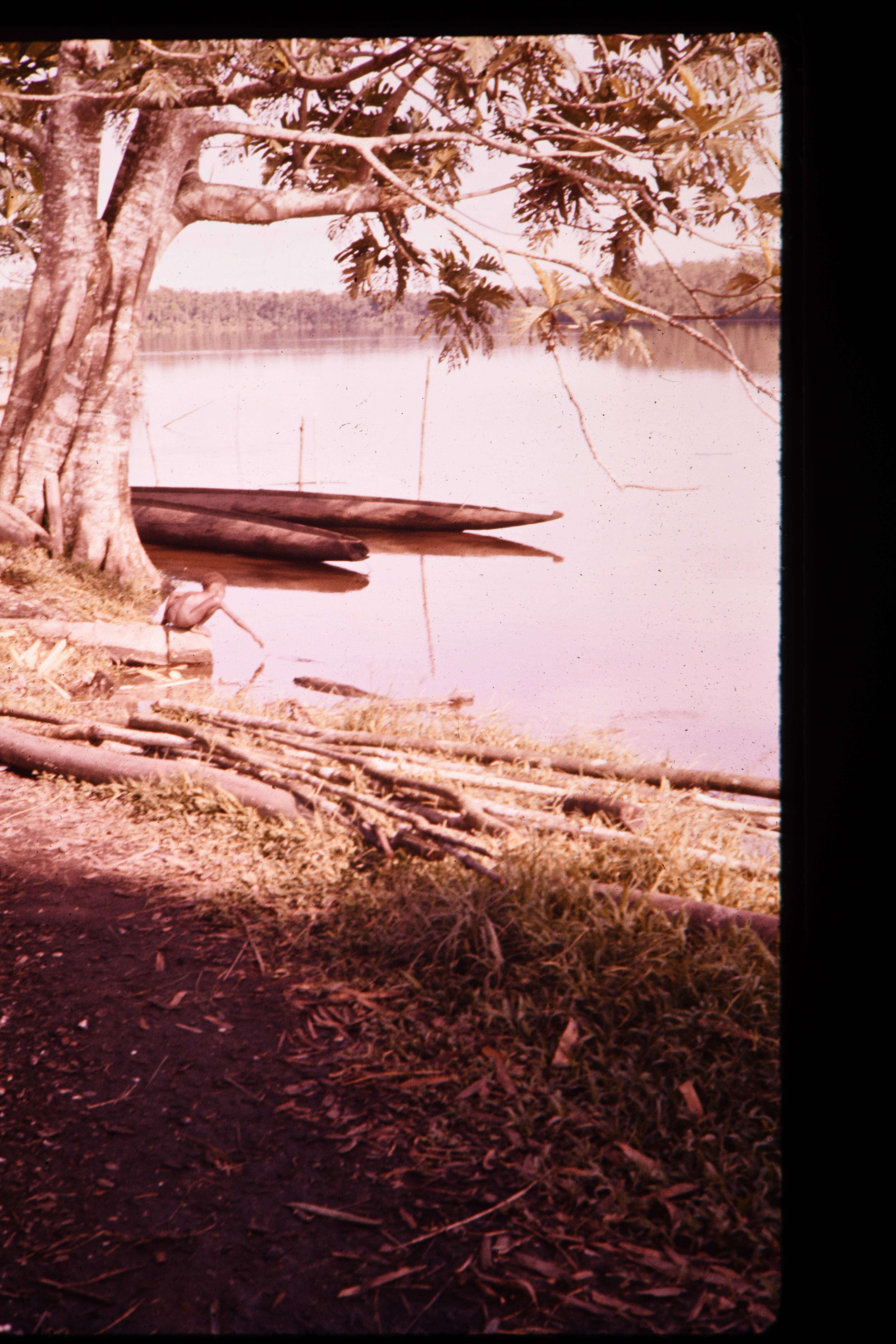 Grote boom aan rivieroever met klein Papoeajongetje op z'n hurken in het water reikend.
