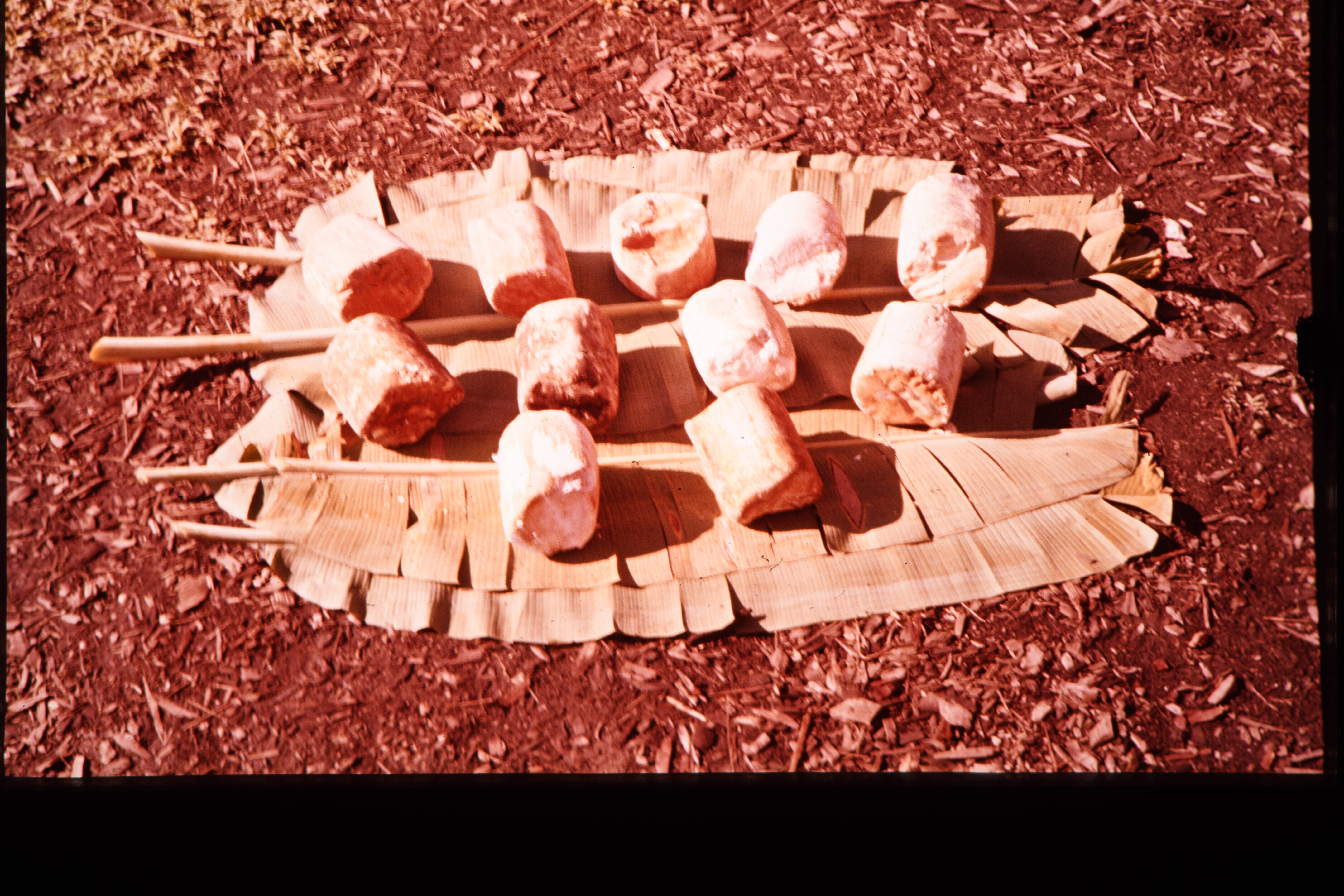 Brokken sago op pisangbladeren. Sago mij aangeboden door de leden van de jö Menemgai als contraprestatie voor de ¼ pakjes shag die ik in dec. 1960 bij elk van de vuurplaatsen in de jö had neergelegd, en die bedoeld waren als betaling voor de gastvrijheid.