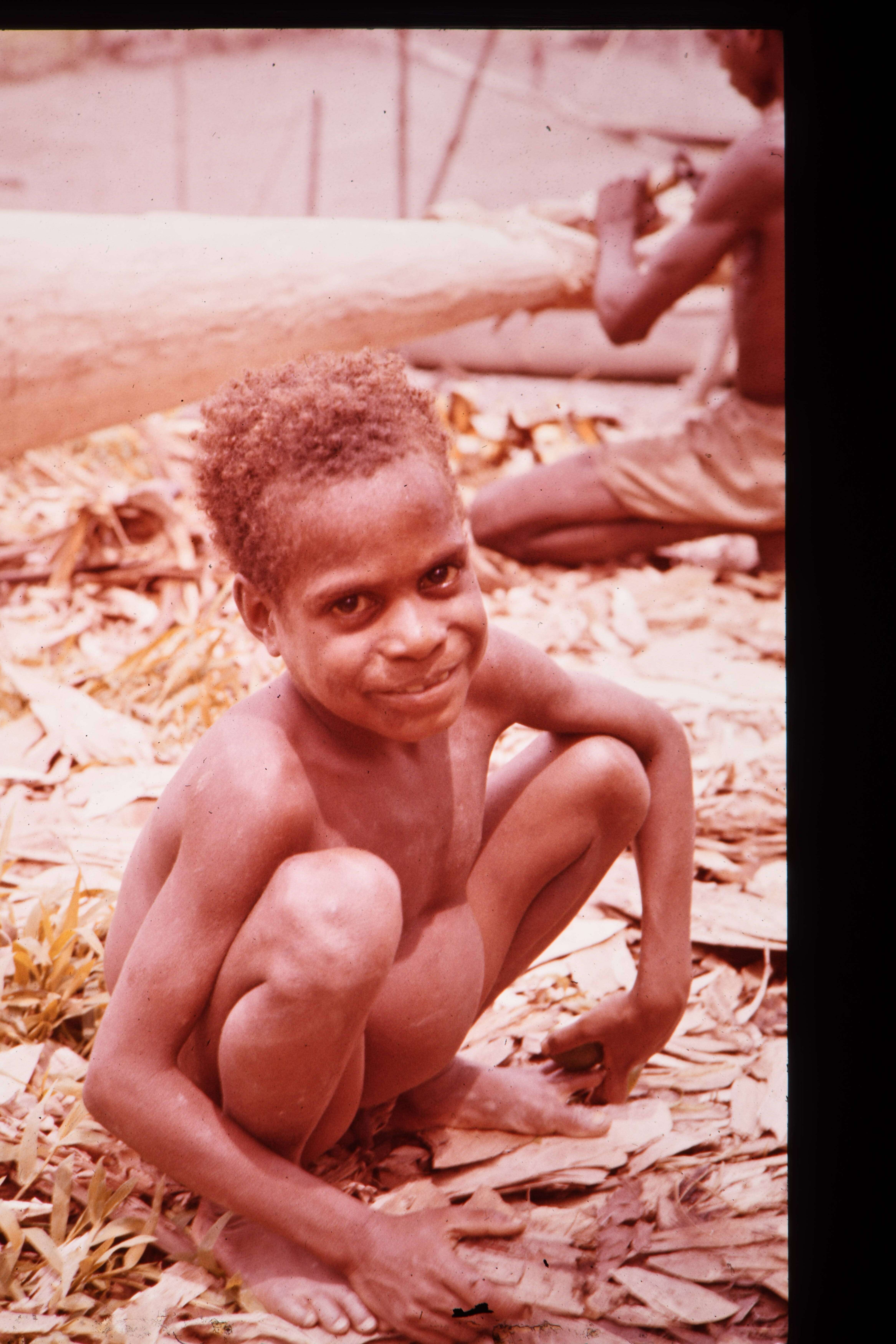 In de modderige kali-oever naar benlen liggende loopboom, met er schuin opgetrokken prauwen, terwijl aan de overkant van de kali een jongen een dergelijke boom afloopt. 10 feb. 1961.