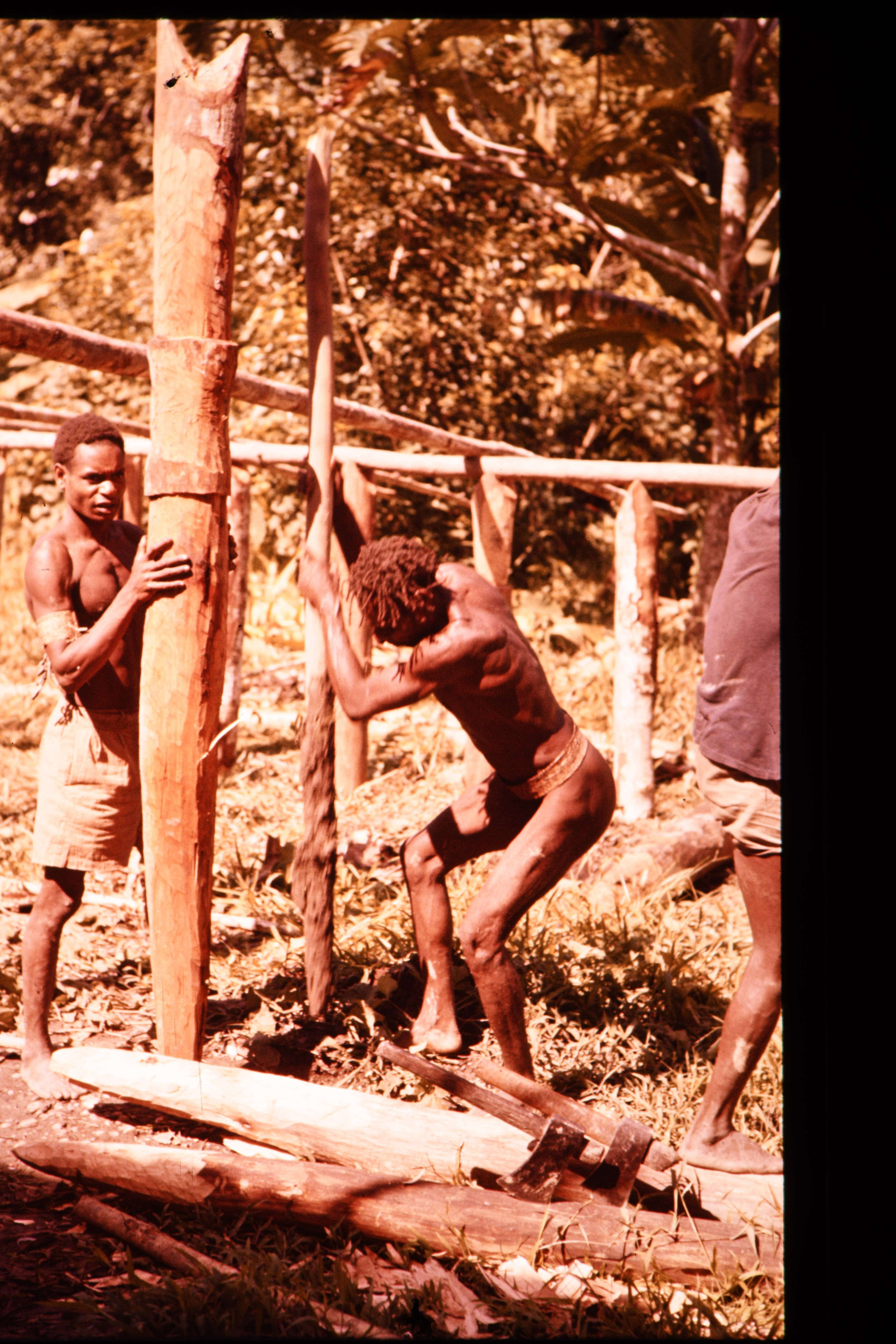 Actie foto's van mensen bezig met het leggen van de vloerbalken voor de jö Amman. Laatste 2 in de serie actie foto's van de spiernaakte Mbatai bezig met indrukken en inzetten van jüresü om de vloerbalken horizontaal te krijgen. 16 feb. 1961, 09.30 t/m 10