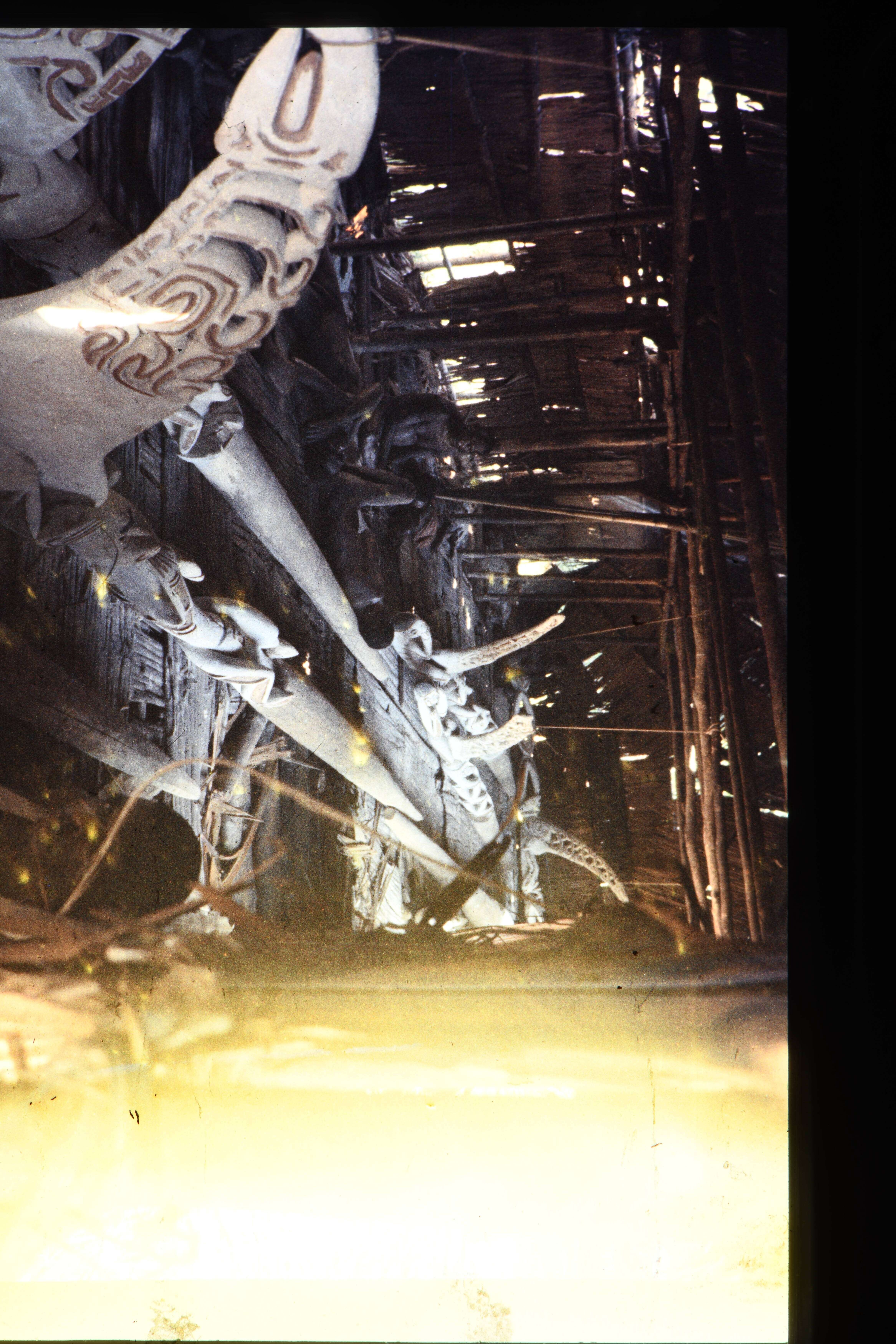 Binnenaanzicht van het tijdelijke mannenhuis Amman met daarin een aantal van de voorouderpalen welke inmiddels zijn afgewerkt, en gekleurd met kalk en rode oker.