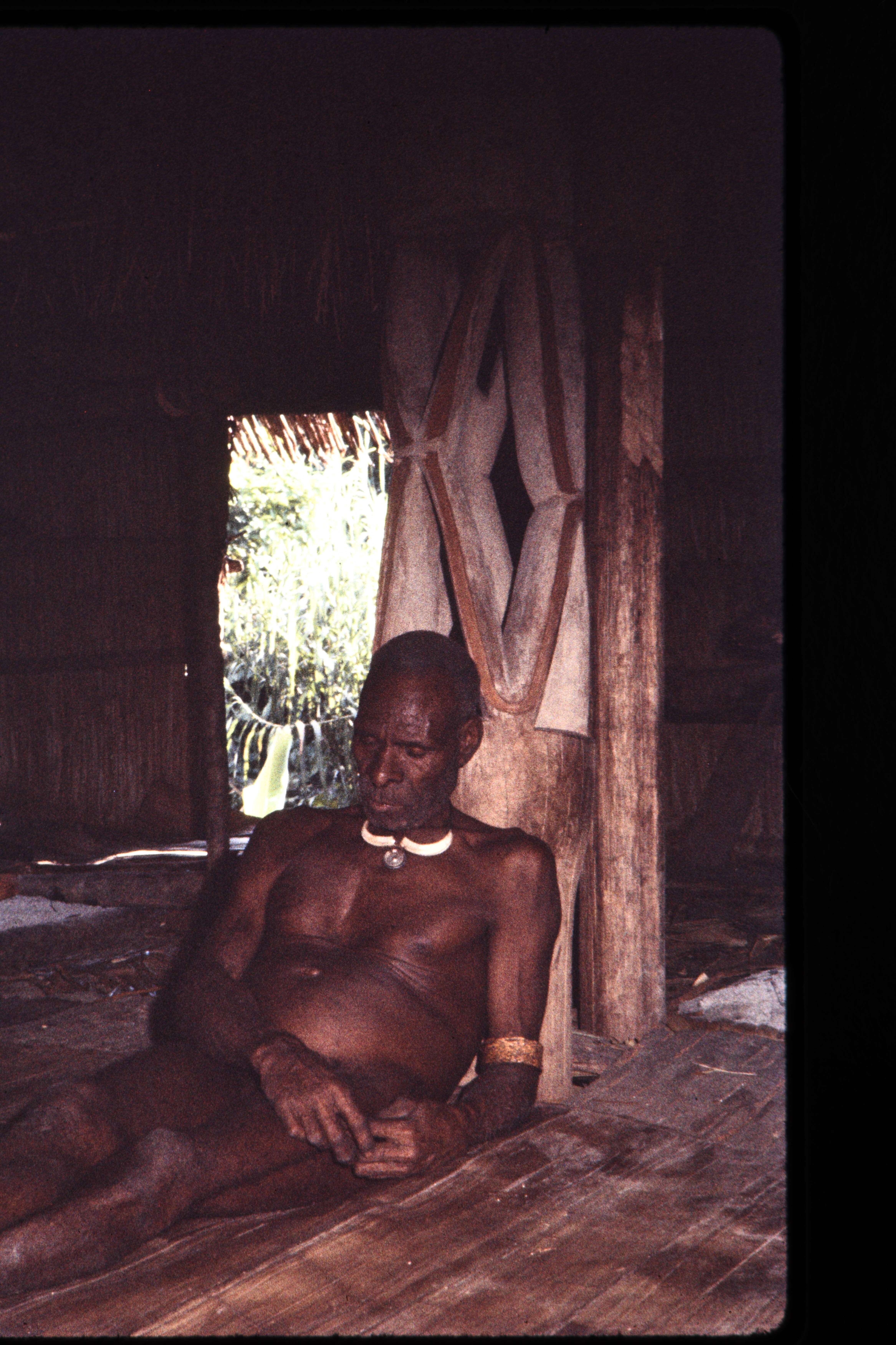 Vader van Kamis lui liggend tegen bisjpaal van jause Mbapmes, flash.
