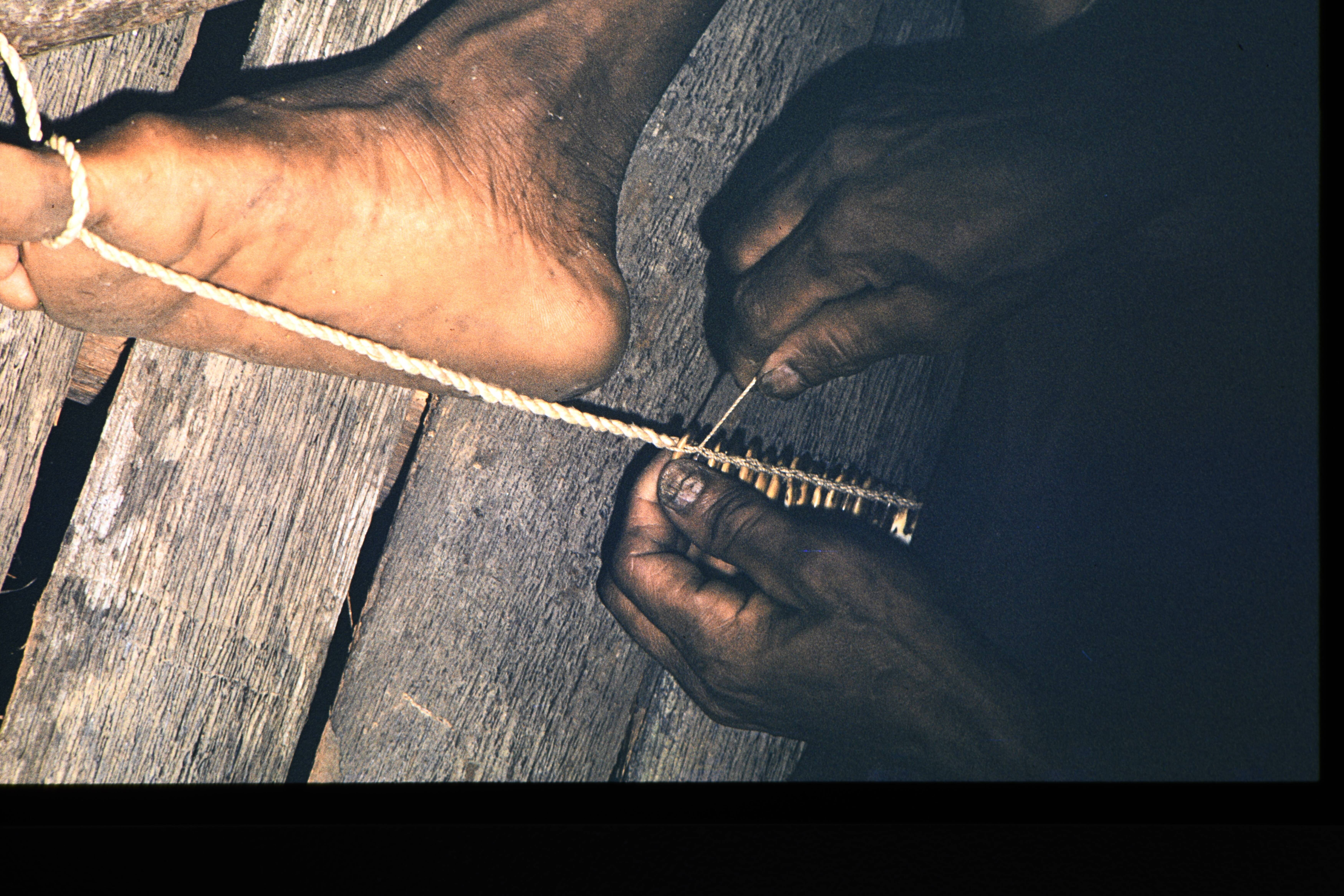 Handen bezig hondentanden aan een koord te rijgen. Ndetho, 2 april 1961. flash onderbelicht.