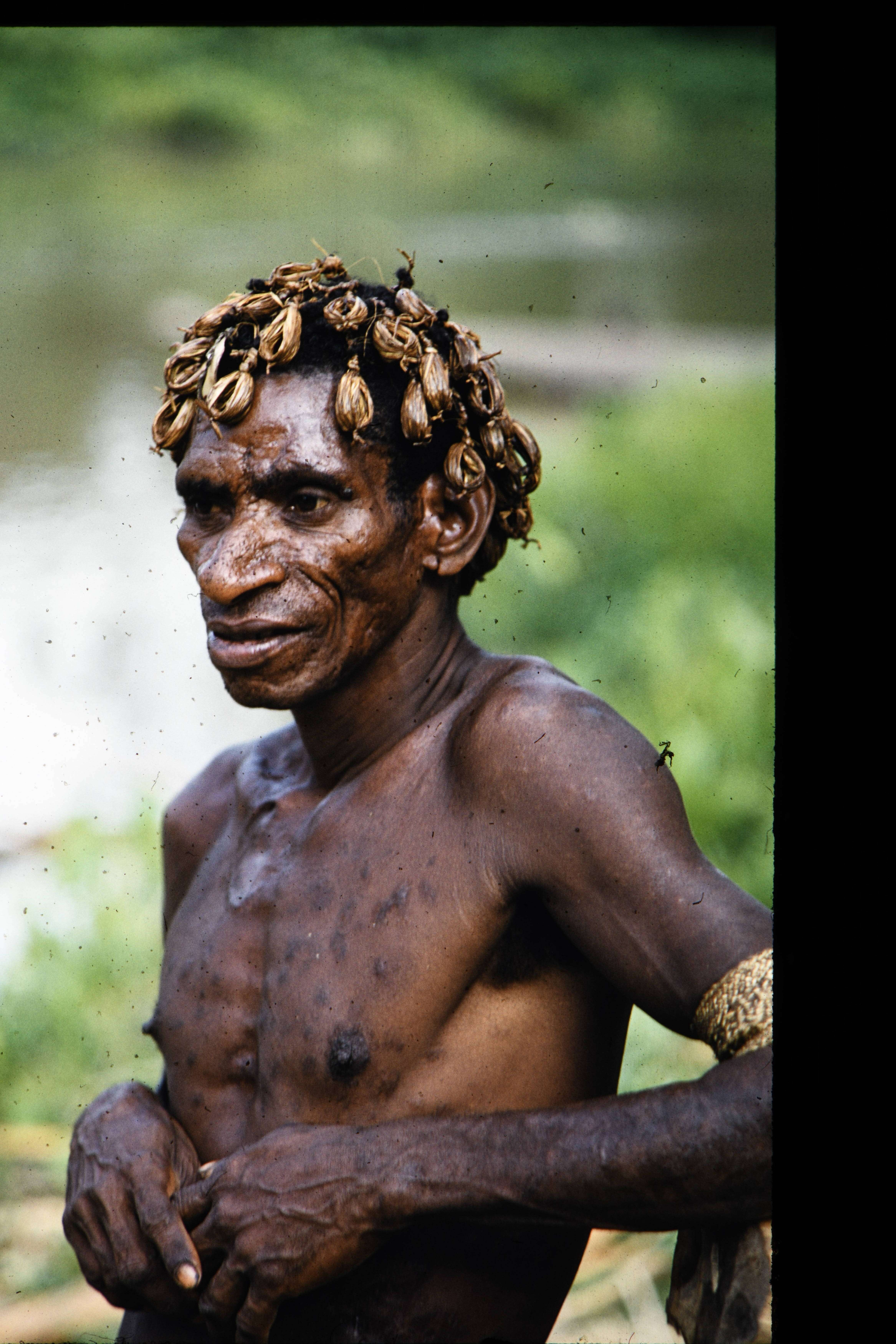 Portretten van man met korte haarinvlechtingen (man met vergroeide arm), 7 april 1961. Tjekamenem.