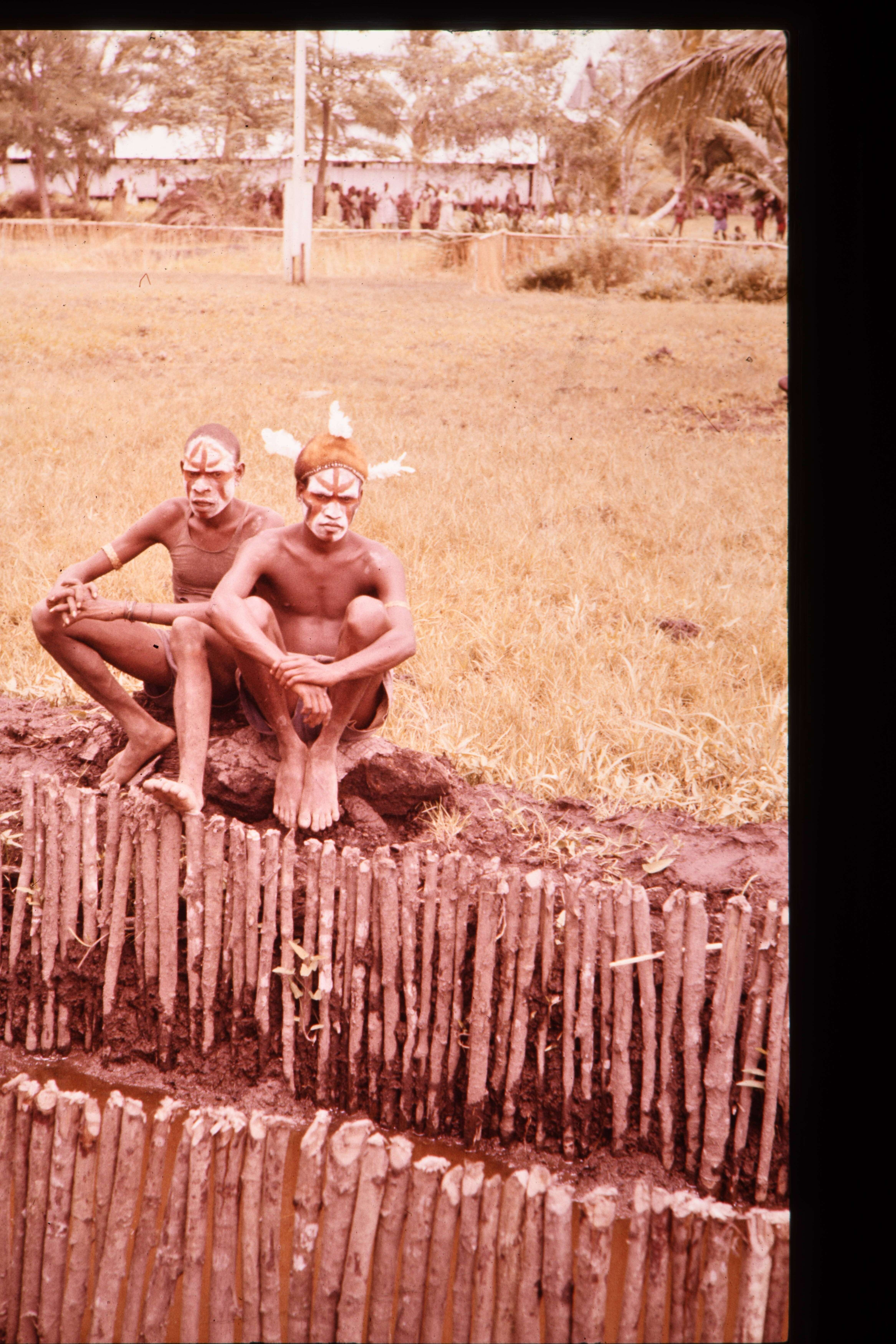 Twee mannen uit het dorp Jepim, aan de kust, met gezichtsbeschildering, naast elkaar op een boomstronk aan de overkant van een sloot zittend.