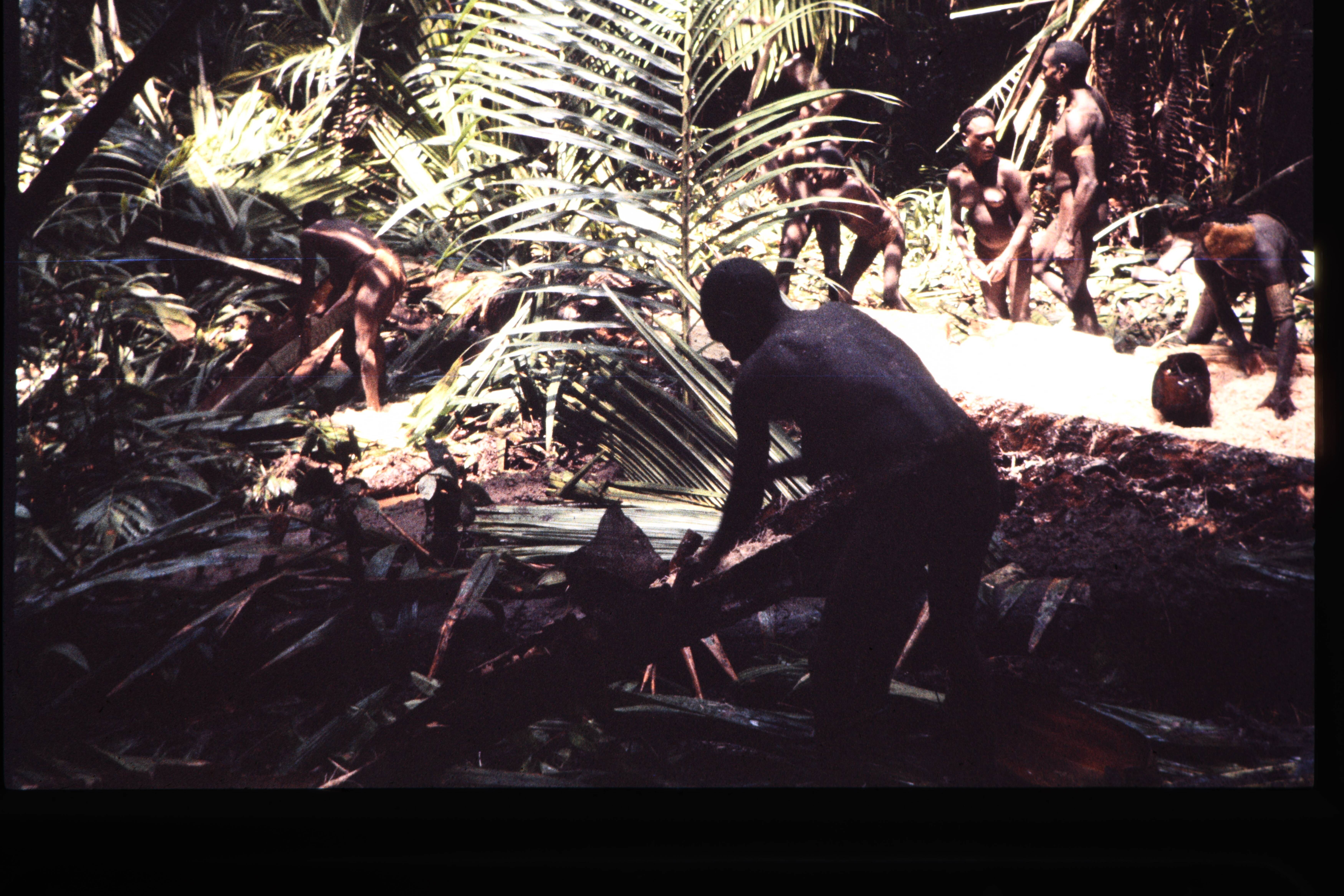 Overzicht van 2 perstroggen + boom, waar men onder schaduw bladeren voortgaat met kloppen.