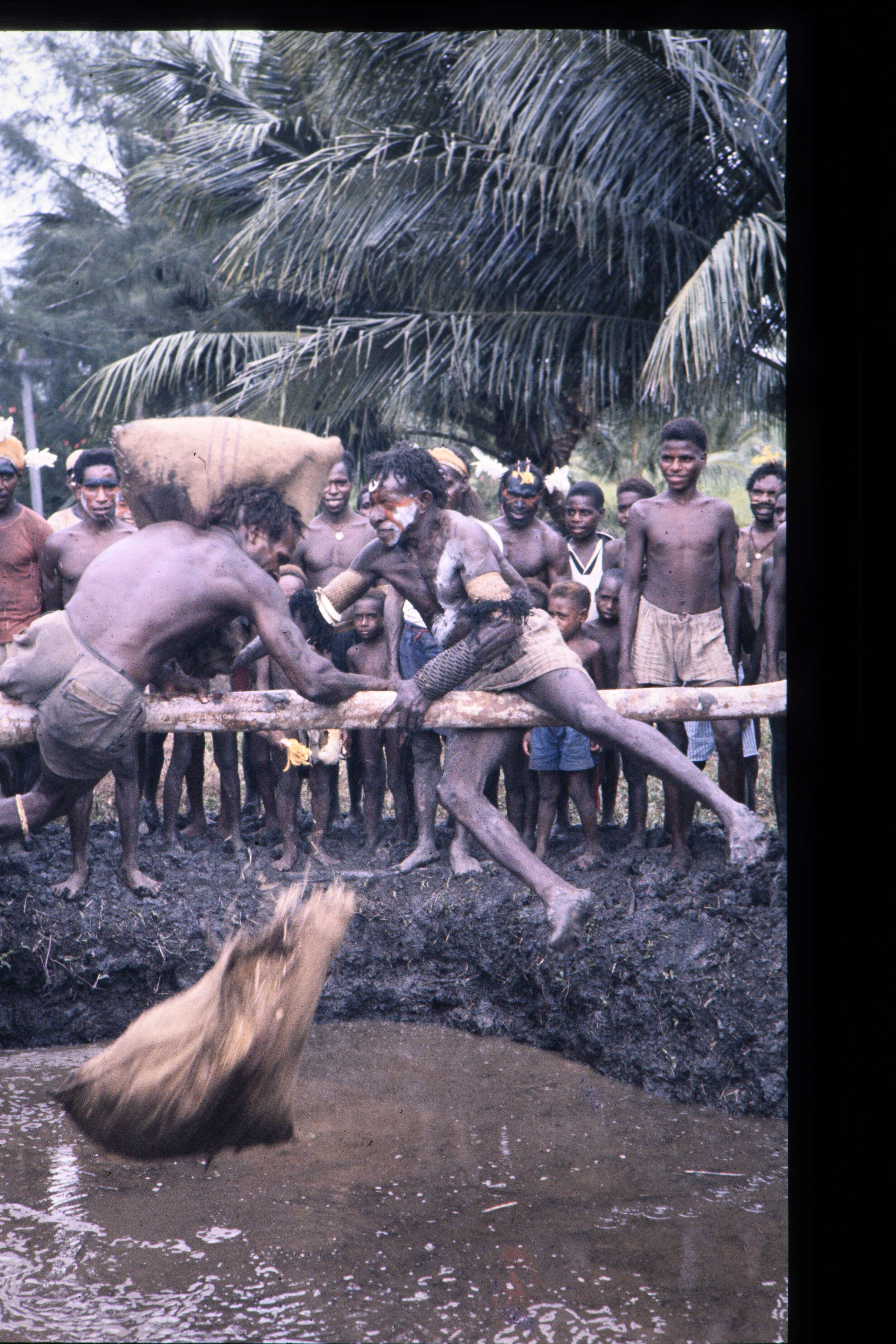 Zakkloppen op een paal boven een met water gevulde kuil.
