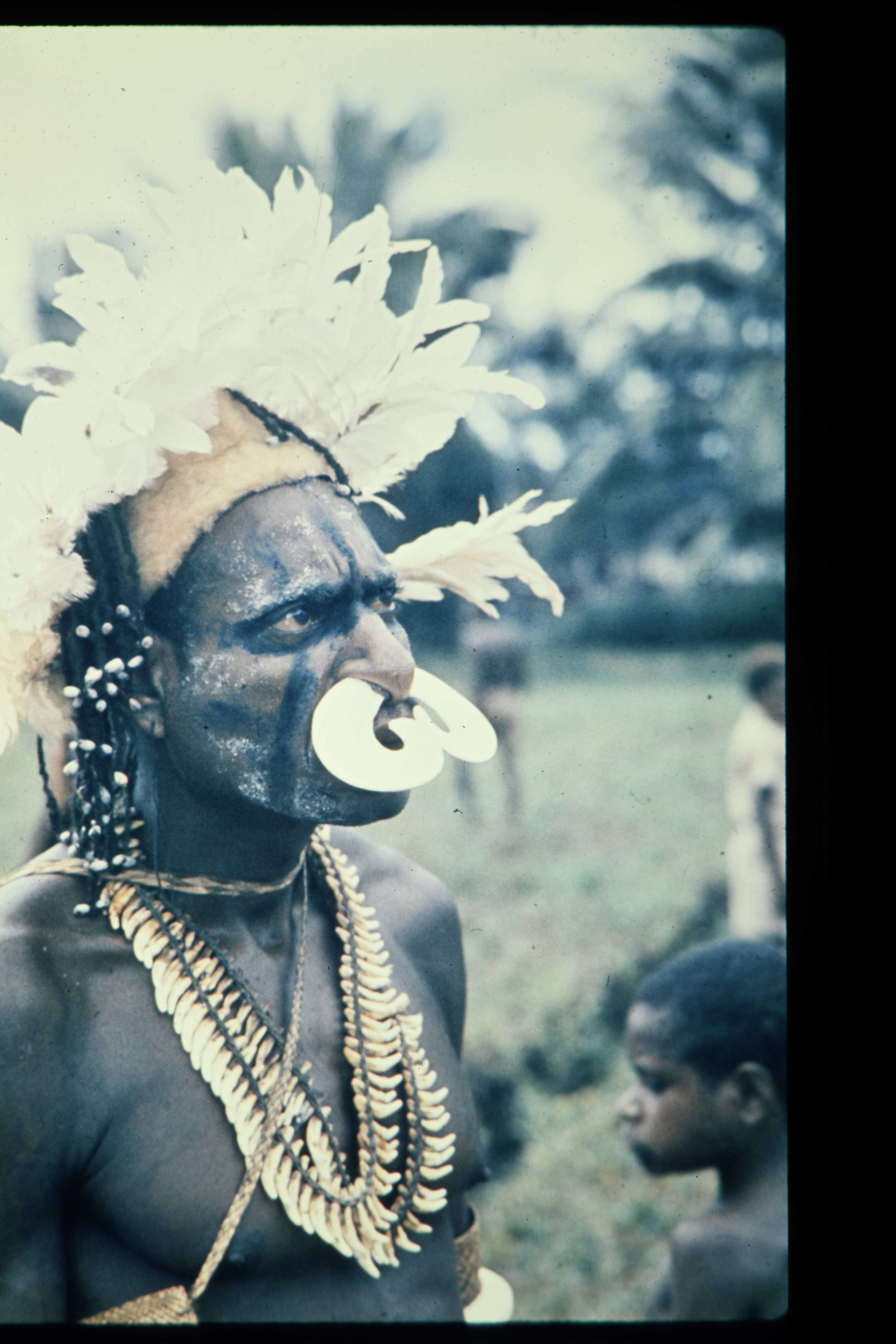 Portret van een man uit een van de kustdorpen van het Asmat-gebied in feesttooi. Hij draagt een hoofdband van kuskus- of opossum-bont. (Dit dier is als vruchteneter symbool voor de koppensneller, omdat de vrucht van een boom beschouwd wordt als het hoofd