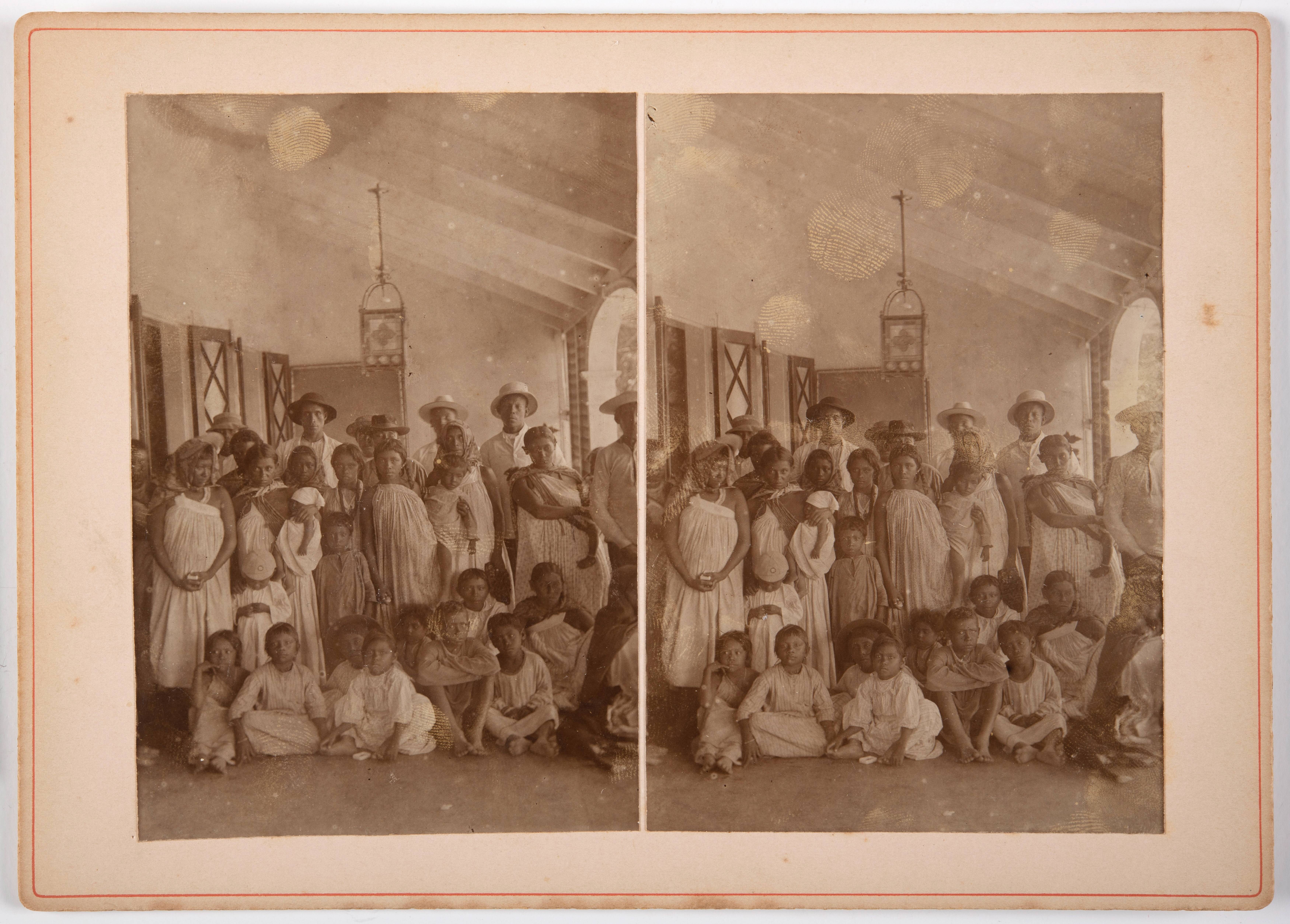Groepsfoto van inheemsen op het commissariaat te Nickerie