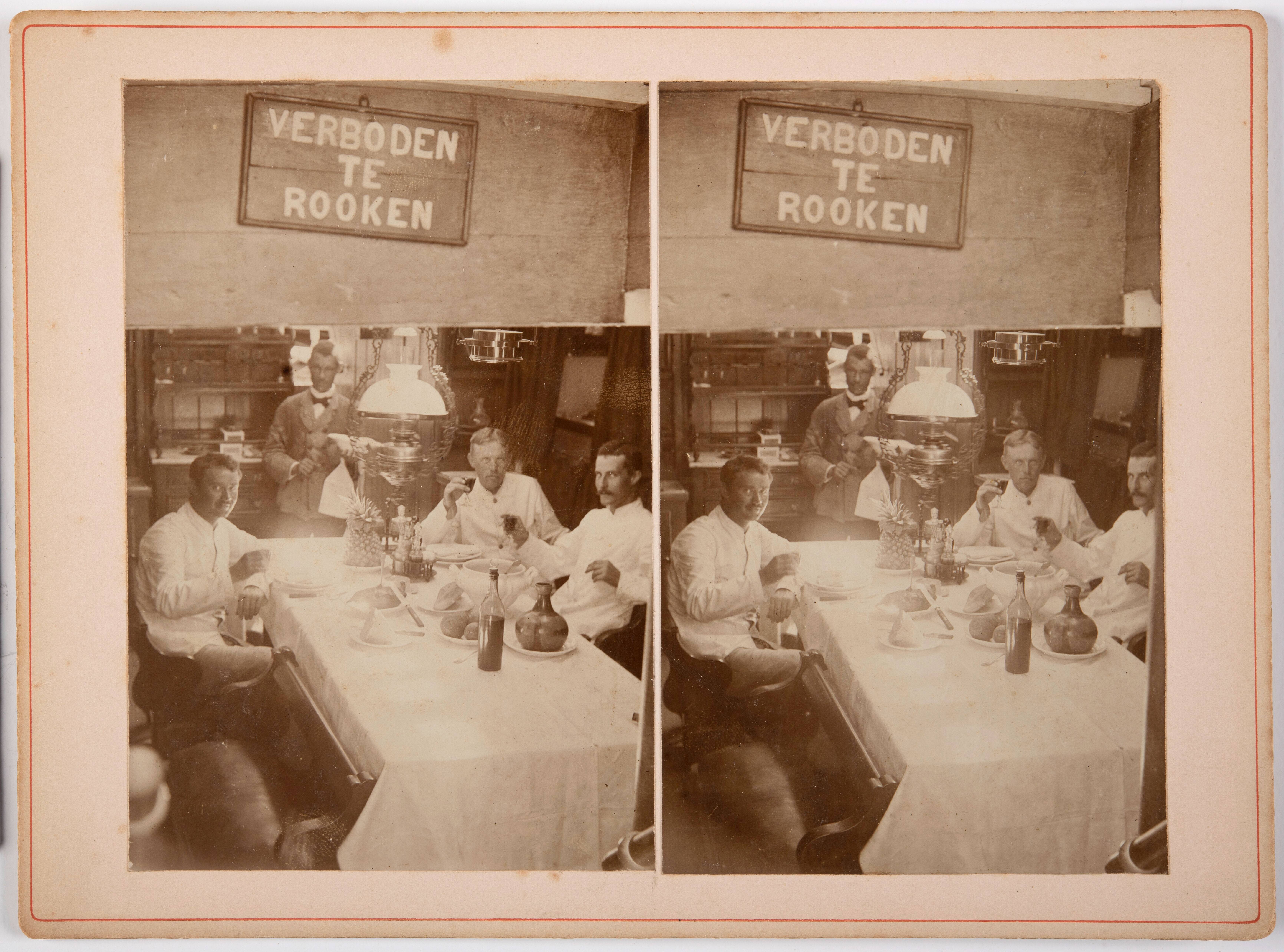 Kajuit van de schoener 'Nickerie' tijdens een maaltijd