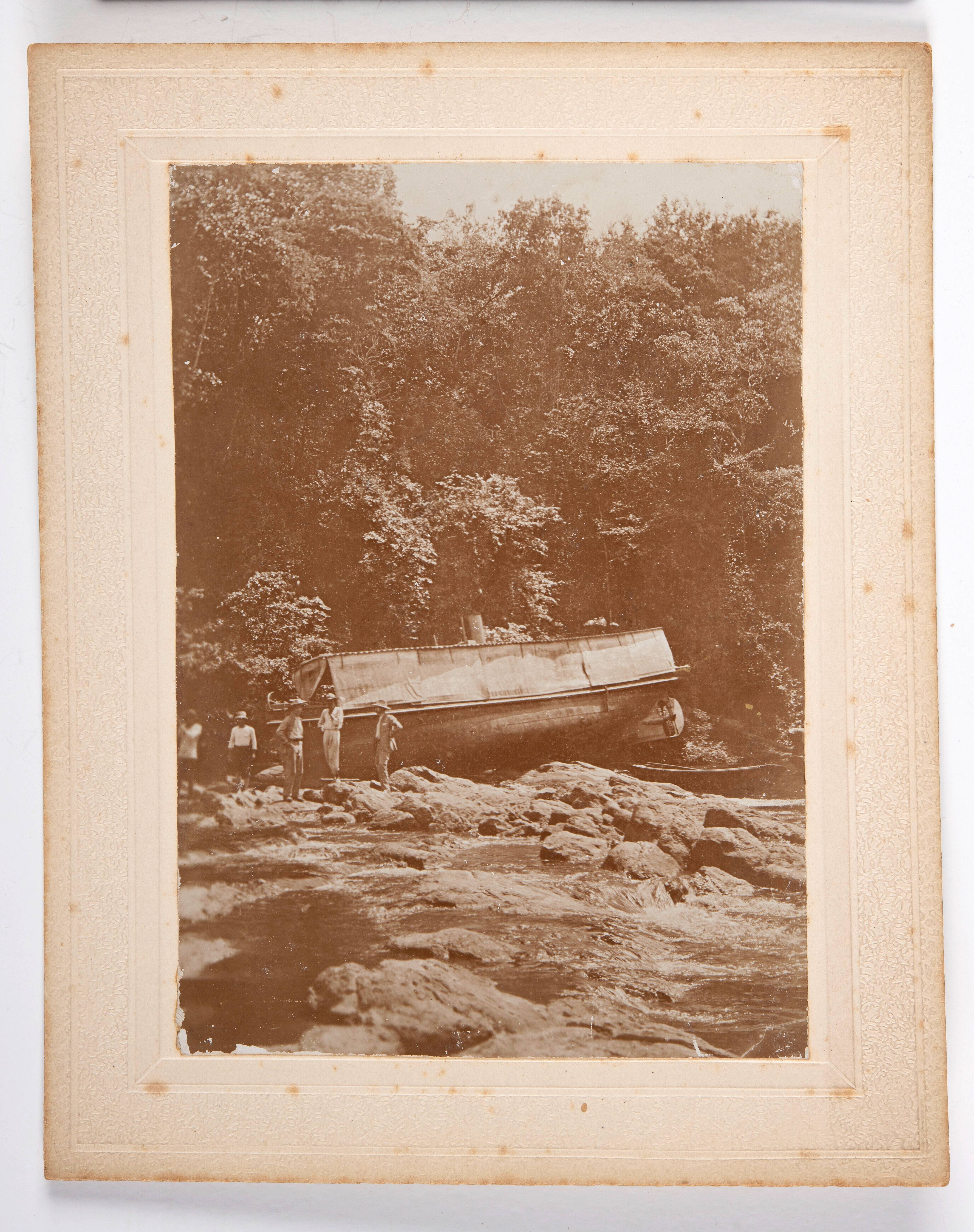 Het op de rotsen van de Boven Nickerie-rivier vastgelopen stoombarkas 'Gottica'