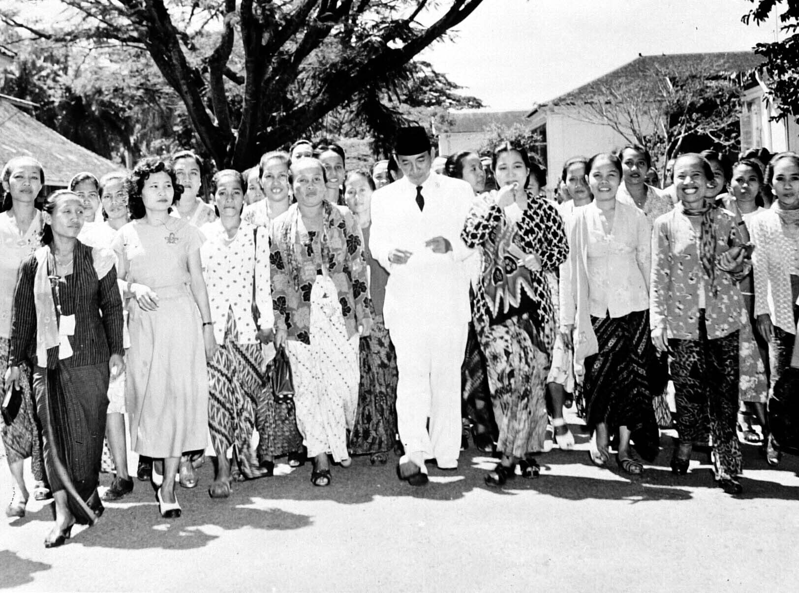 President Soekarno en zijn vrouw met deelnemers aan een KONAWI-congres