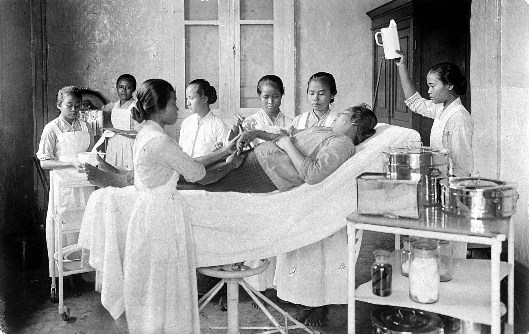 A midwafe and nurses taking care of a patient in the hospital, possibly in the missionary post Mergaredja or Margaredja