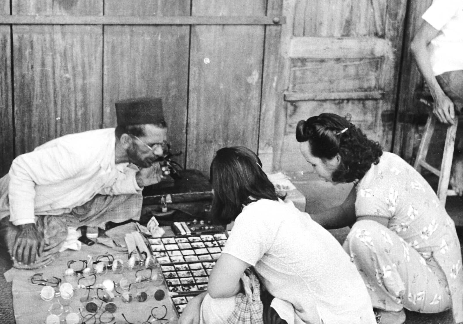 Chinese vrouwen bekijken stenen en brillen op de markt in Jakarta, Java