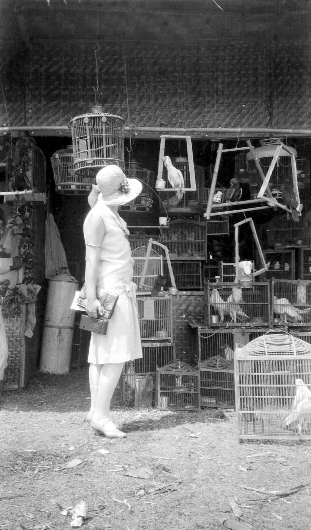 Een Europese vrouw bekijkt een vogelwinkel in Jakarta, Java