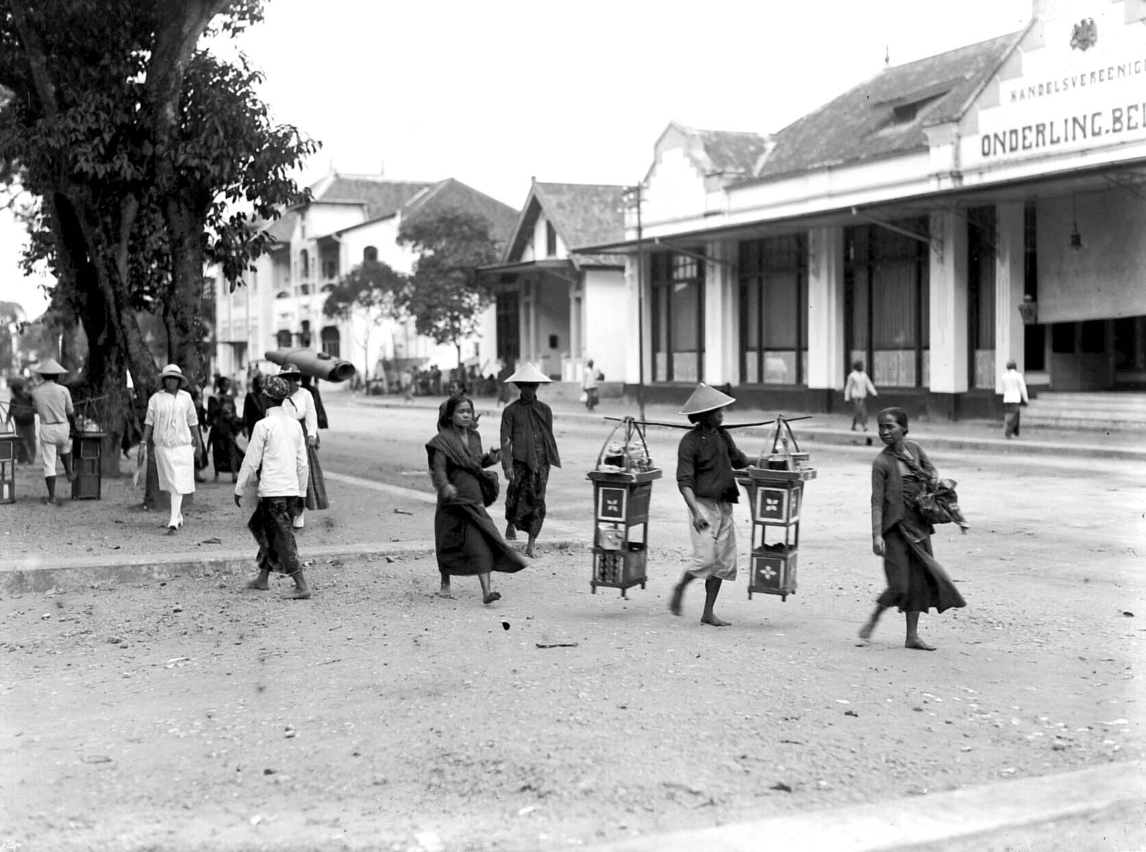 Een verkoper van stroop (een koele drank) in de hoofdstraat Malioboro te Yogyakarta, Java. De Handelsvereniging 'Onderling Belang' (rechts in beeld) werd in 1934 opgeheven.